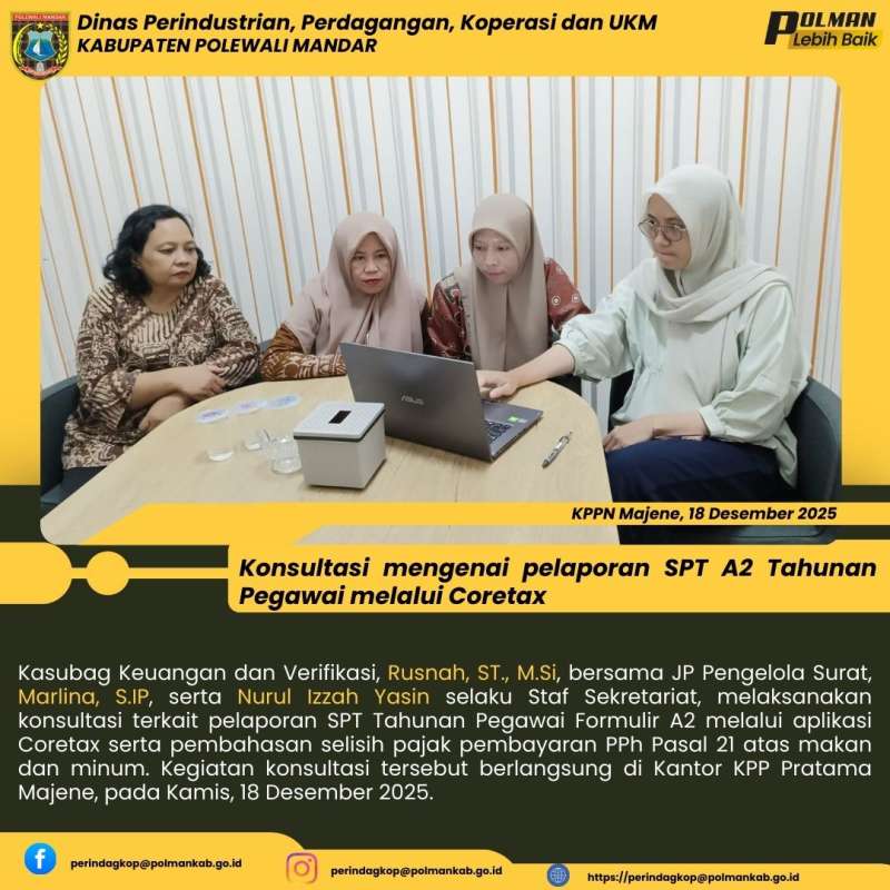 Kasubag Keuangan dan Verifikasi, Rusnah, ST., M.Si, bersama JP Pengelola Surat, Marlina, S.IP, serta Nurul Izzah Yasin selaku Staf Sekretariat, melaksanakan konsultasi terkait pelaporan SPT Tahunan Pegawai Formulir A2 melalui aplikasi Coretax serta pembahasan selisih pajak pembayaran PPh Pasal 21 atas makan dan minum. Kegiatan konsultasi tersebut berlangsung di Kantor KPP Pratama Majene, pada Kamis, 18 Desember 2025.