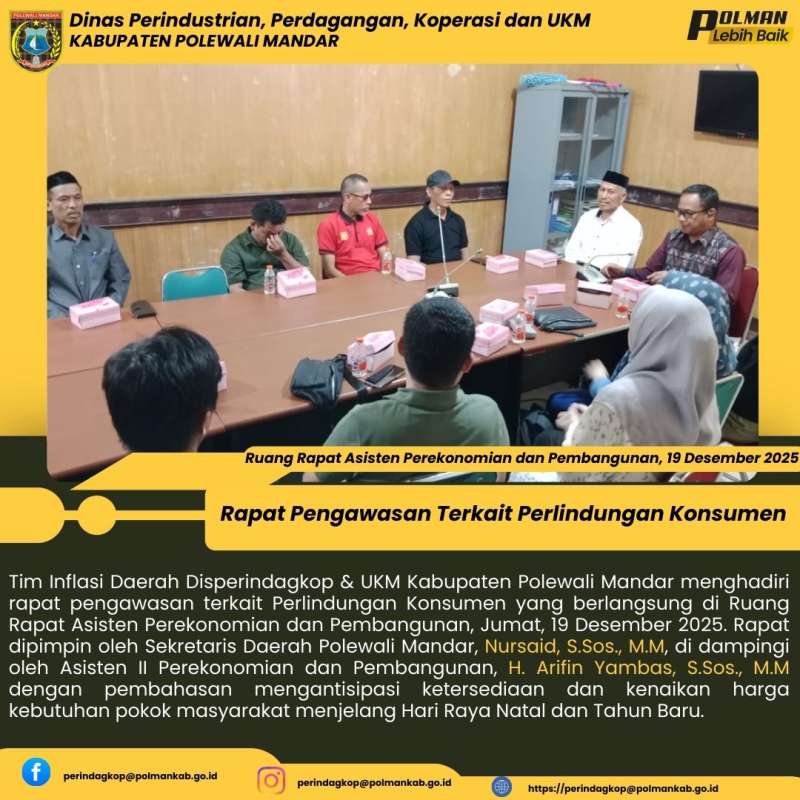 Tim Inflasi Daerah Disperindagkop & UKM Kabupaten Polewali Mandar menghadiri rapat pengawasan terkait Perlindungan Konsumen yang berlangsung di Ruang Rapat Asisten Perekonomian dan Pembangunan, Jumat, 19 Desember 2025. Rapat dipimpin oleh Sekretaris Daerah Polewali Mandar, Nursaid, S.Sos., M.M, di dampingi oleh Asisten II Perekonomian dan Pembangunan, H. Arifin Yambas, S.Sos., M.M dengan pembahasan mengantisipasi ketersediaan dan kenaikan harga kebutuhan pokok masyarakat menjelang Hari Raya Natal dan Tahun Baru.
