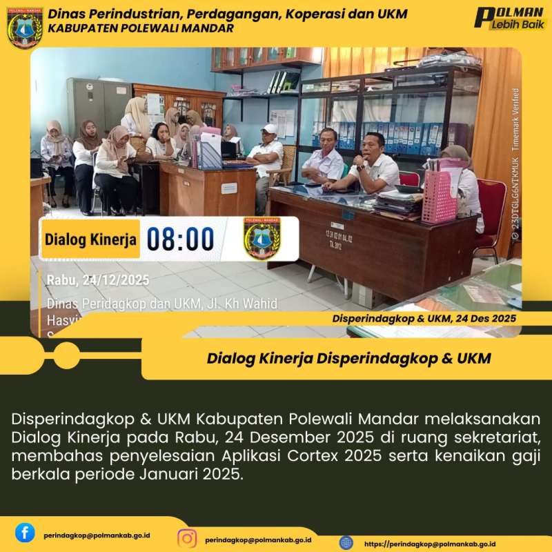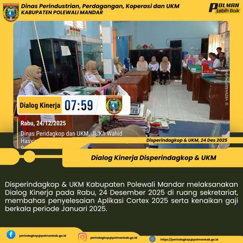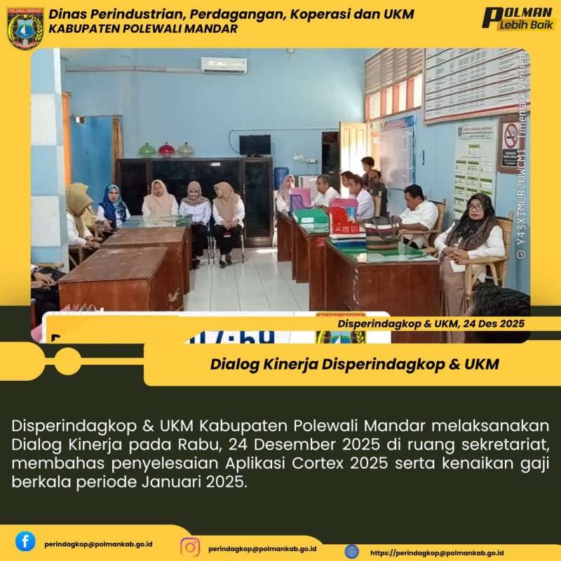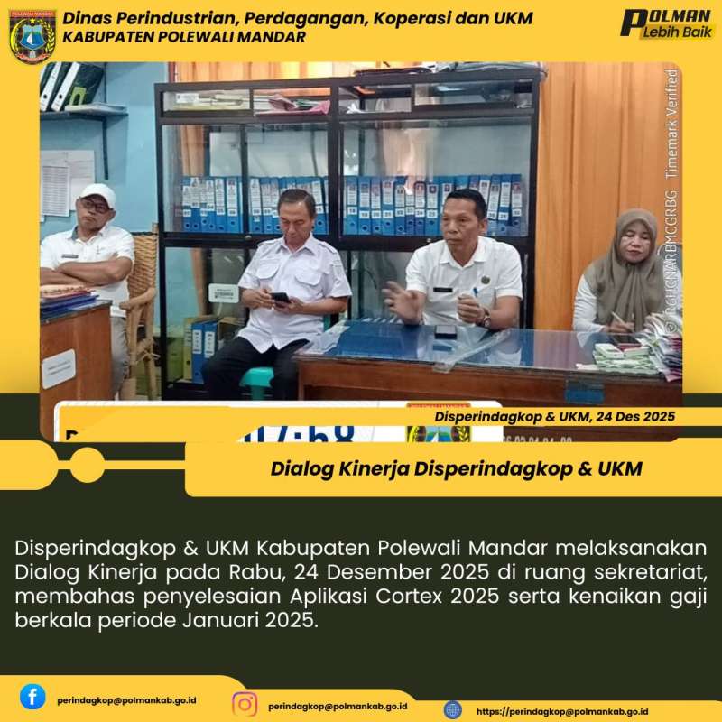 Disperindagkop & UKM Kabupaten Polewali Mandar melaksanakan Dialog Kinerja pada Rabu, 24 Desember 2025 di ruang sekretariat, membahas penyelesaian Aplikasi Cortex 2025 serta kenaikan gaji berkala periode Januari 2025.