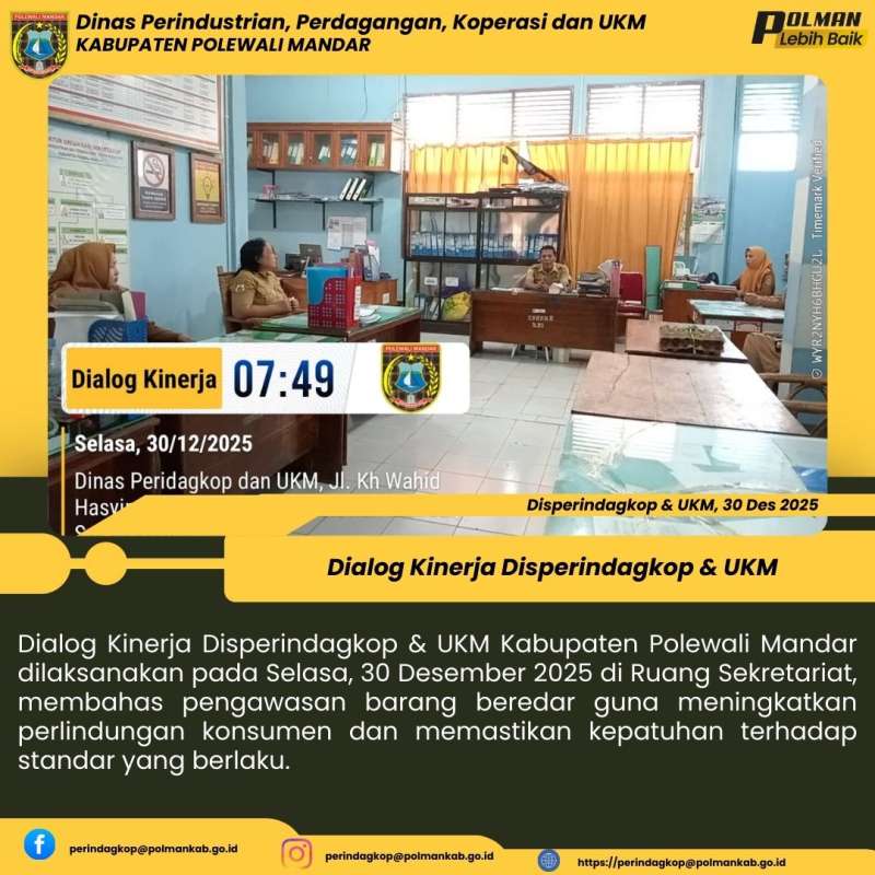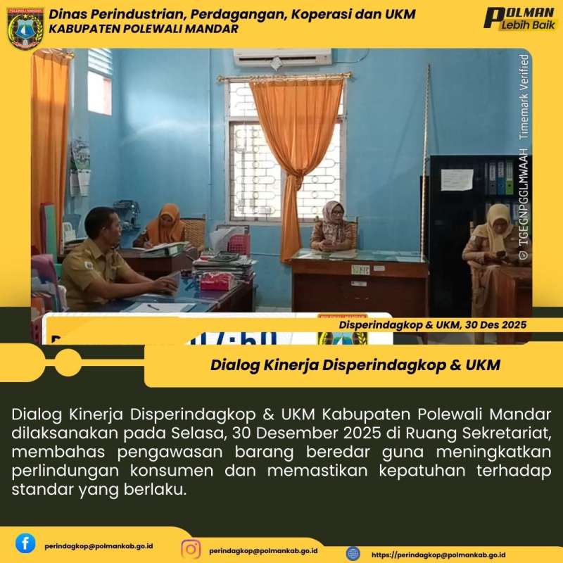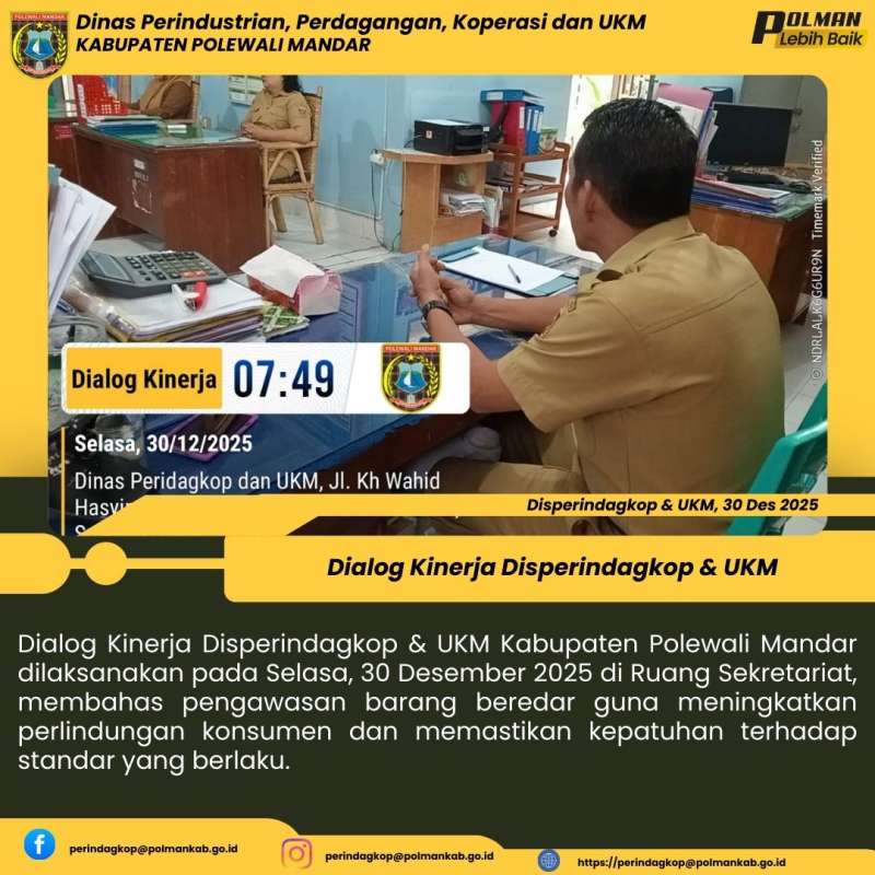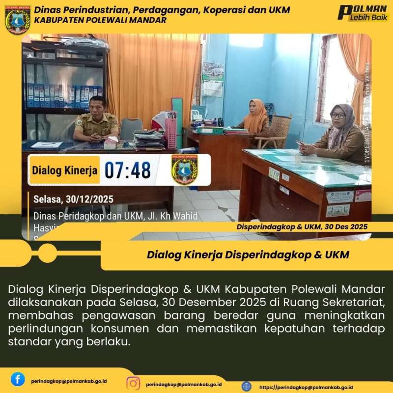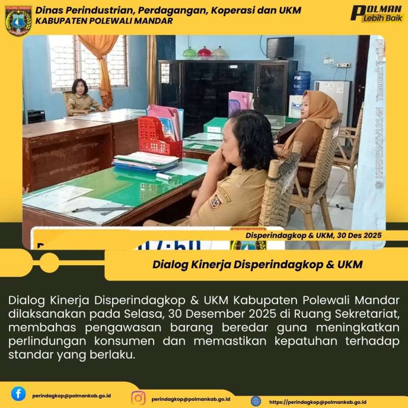 Dialog Kinerja Disperindagkop & UKM Kabupaten Polewali Mandar dilaksanakan pada Selasa, 30 Desember 2025 di Ruang Sekretariat, membahas pengawasan barang beredar guna meningkatkan perlindungan konsumen dan memastikan kepatuhan terhadap standar yang berlaku.