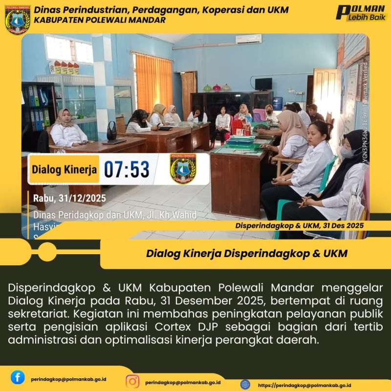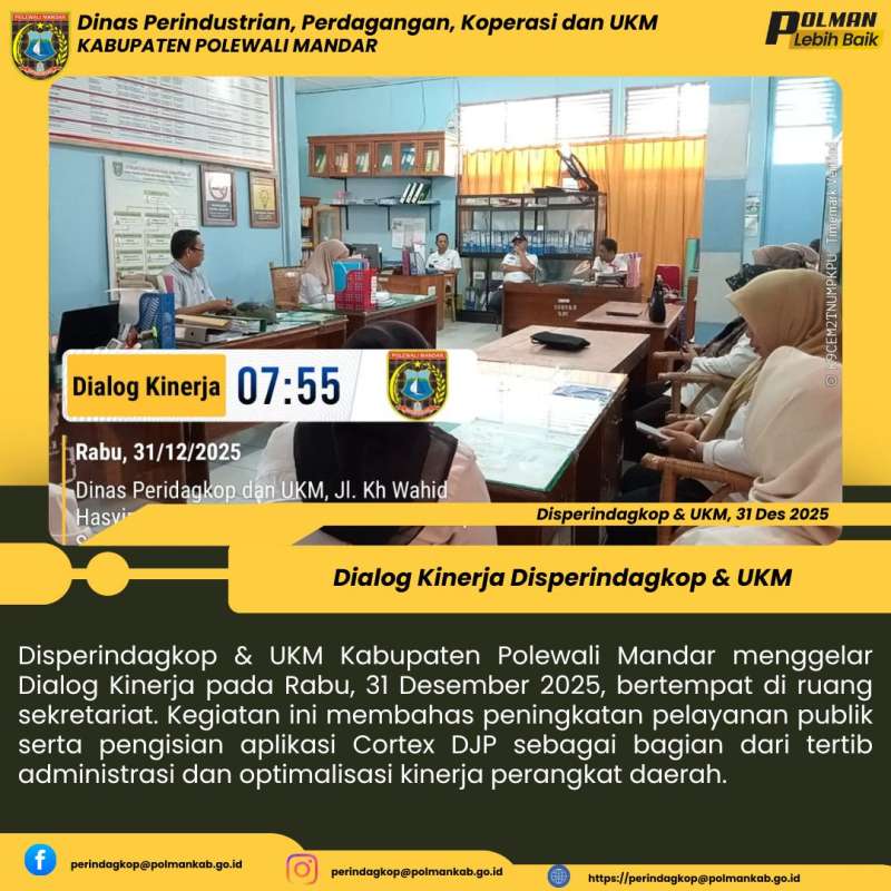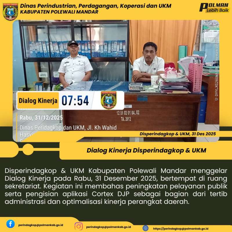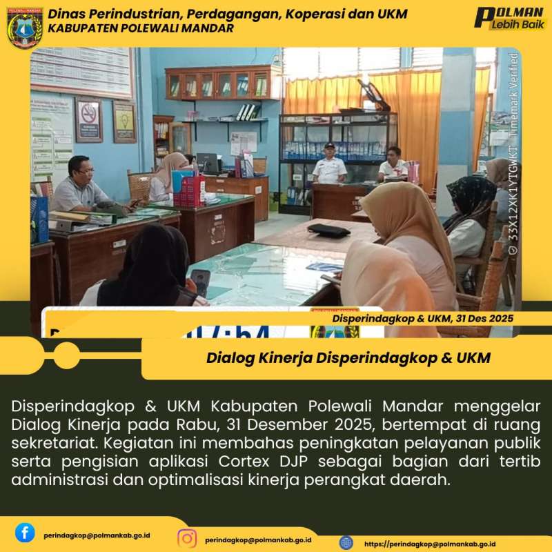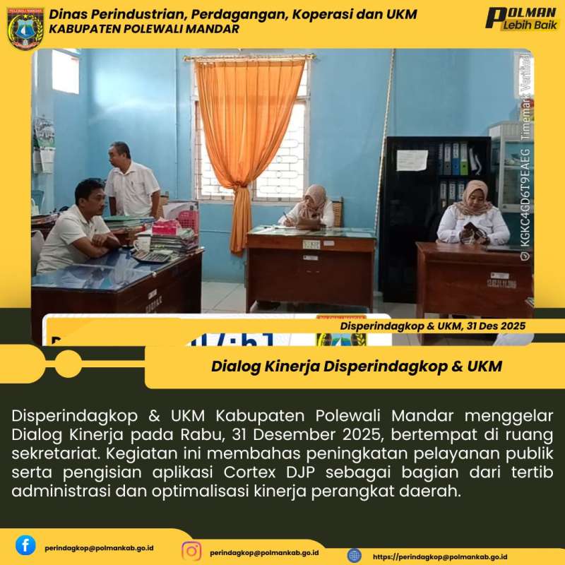 Disperindagkop & UKM Kabupaten Polewali Mandar menggelar Dialog Kinerja pada Rabu, 31 Desember 2025, bertempat di ruang sekretariat. Kegiatan ini membahas peningkatan pelayanan publik serta pengisian aplikasi Cortex DJP sebagai bagian dari tertib administrasi dan optimalisasi kinerja perangkat daerah.