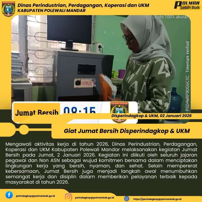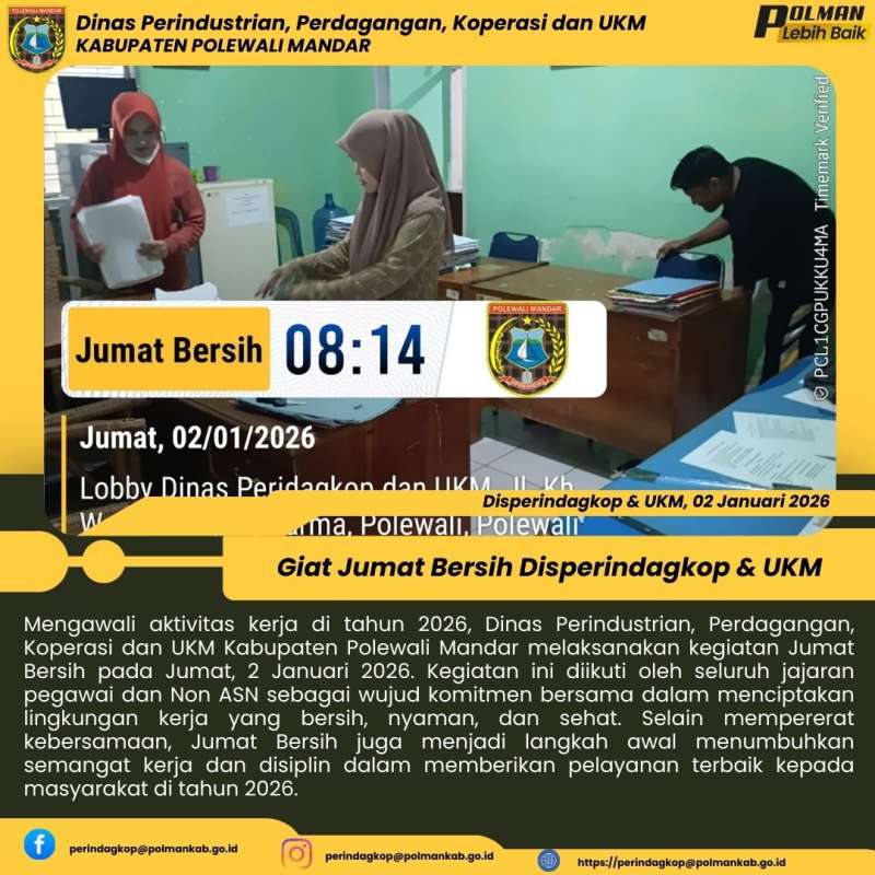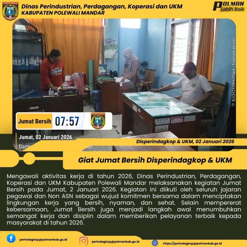Mengawali aktivitas kerja di tahun 2026, Dinas Perindustrian, Perdagangan, Koperasi dan UKM Kabupaten Polewali Mandar melaksanakan kegiatan Jumat Bersih pada Jumat, 2 Januari 2026. Kegiatan ini diikuti oleh seluruh jajaran pegawai dan Non ASN sebagai wujud komitmen bersama dalam menciptakan lingkungan kerja yang bersih, nyaman, dan sehat. Selain mempererat kebersamaan, Jumat Bersih juga menjadi langkah awal menumbuhkan semangat kerja dan disiplin dalam memberikan pelayanan terbaik kepada masyarakat di tahun 2026.
