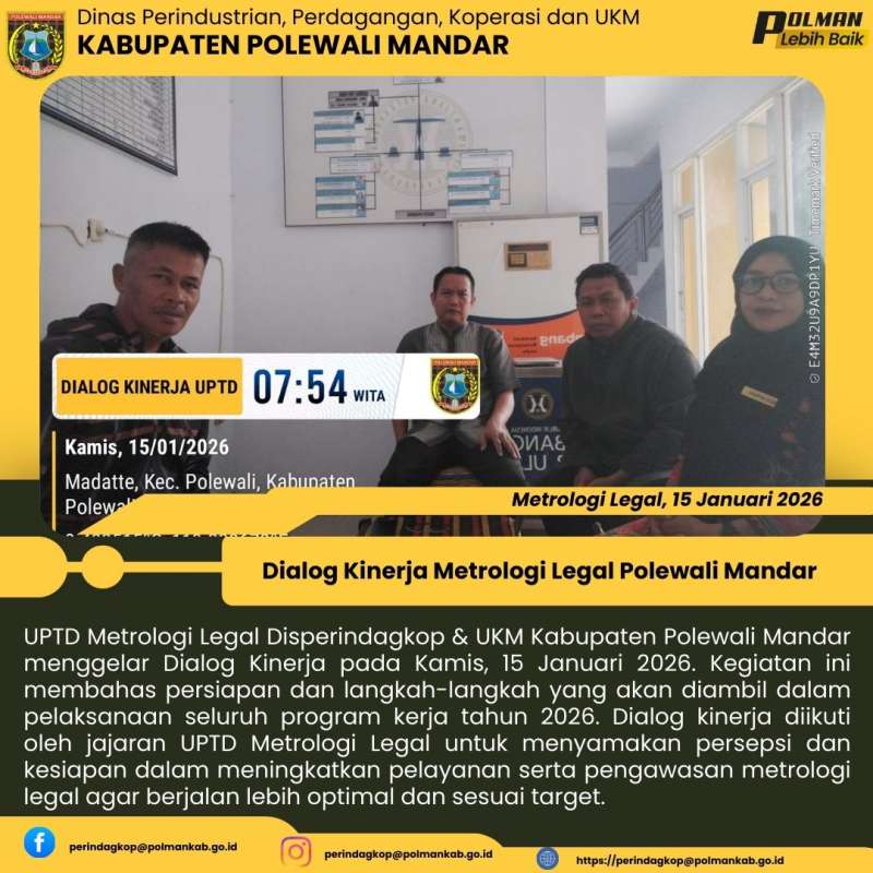 UPTD Metrologi Legal Disperindagkop & UKM Kabupaten Polewali Mandar menggelar Dialog Kinerja pada Kamis, 15 Januari 2026. Kegiatan ini membahas persiapan dan langkah-langkah yang akan diambil dalam pelaksanaan seluruh program kerja tahun 2026. Dialog kinerja diikuti oleh jajaran UPTD Metrologi Legal untuk menyamakan persepsi dan kesiapan dalam meningkatkan pelayanan serta pengawasan metrologi legal agar berjalan lebih optimal dan sesuai target.