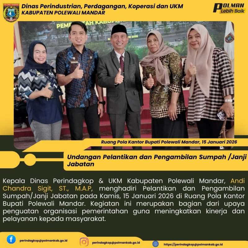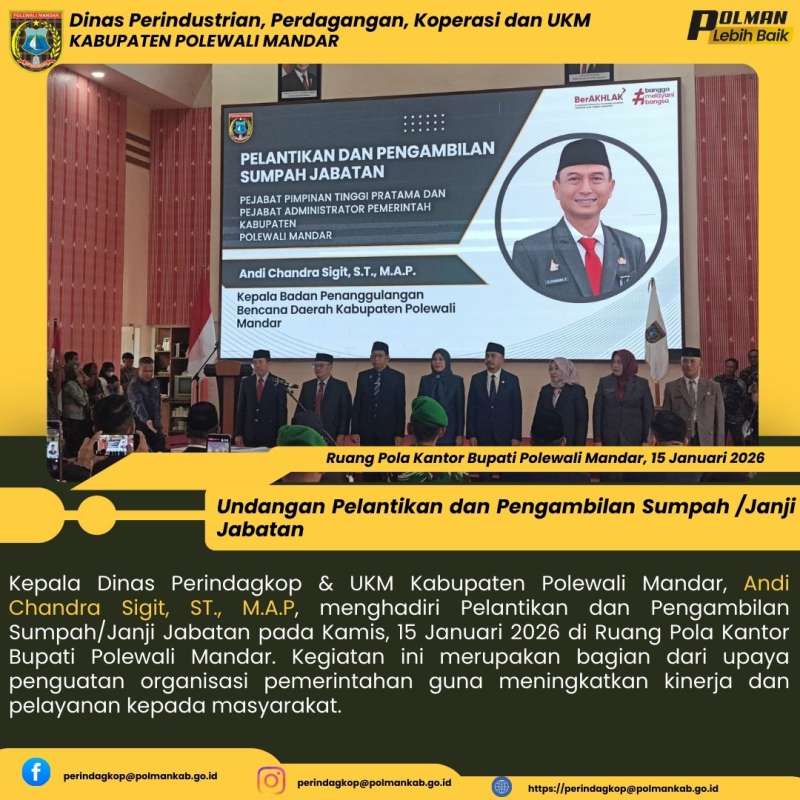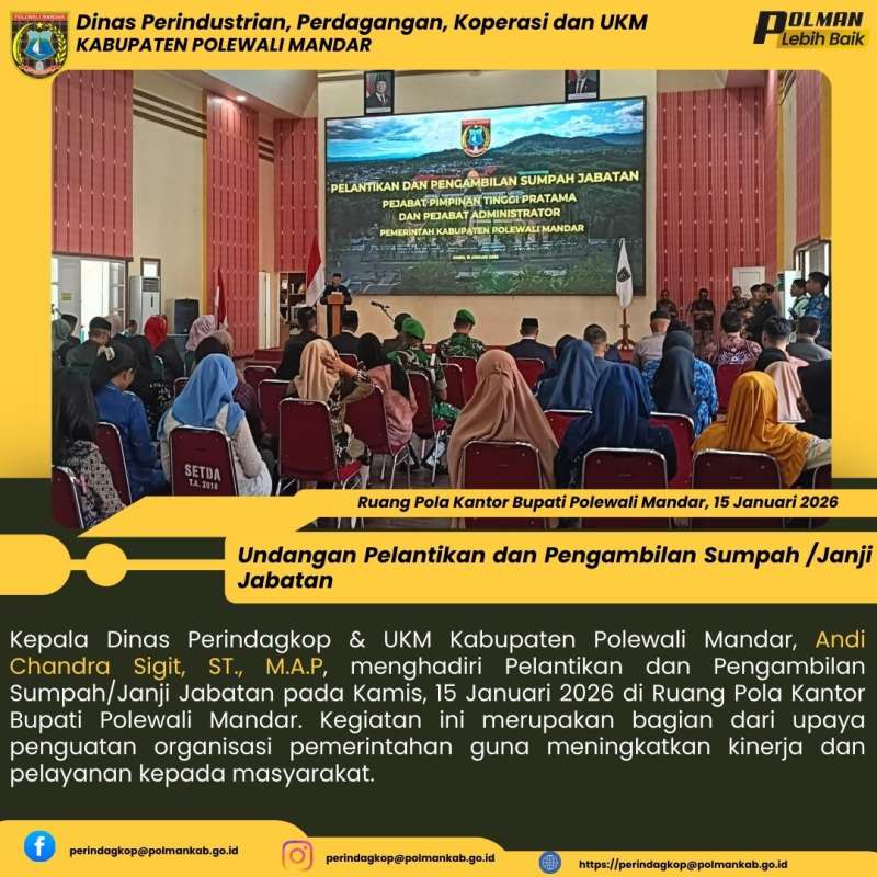 Kepala Dinas Perindagkop & UKM Kabupaten Polewali Mandar, Andi Chandra Sigit, ST., M.A.P, menghadiri Pelantikan dan Pengambilan Sumpah/Janji Jabatan pada Kamis, 15 Januari 2026 di Ruang Pola Kantor Bupati Polewali Mandar. Kegiatan ini merupakan bagian dari upaya penguatan organisasi pemerintahan guna meningkatkan kinerja dan pelayanan kepada masyarakat.