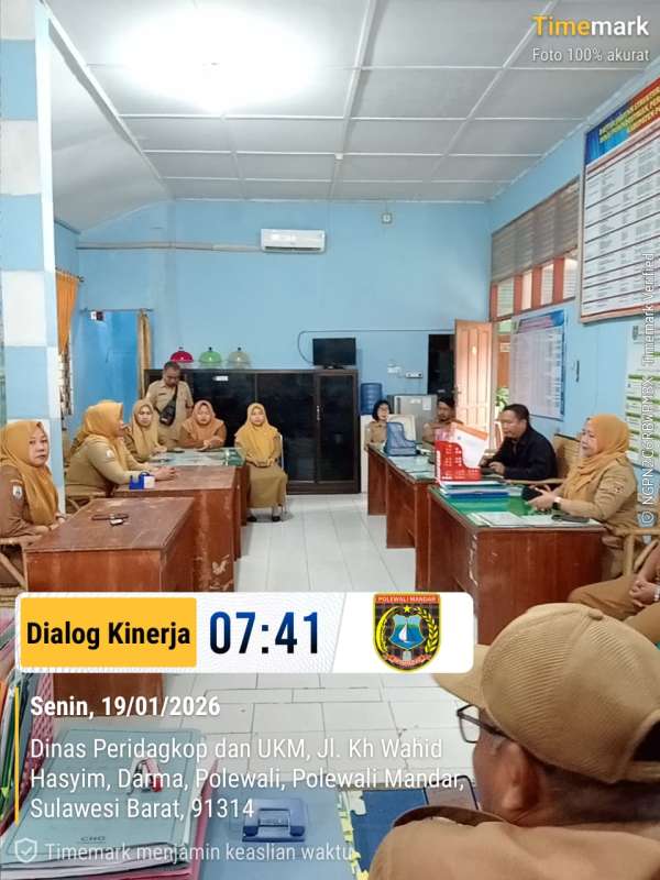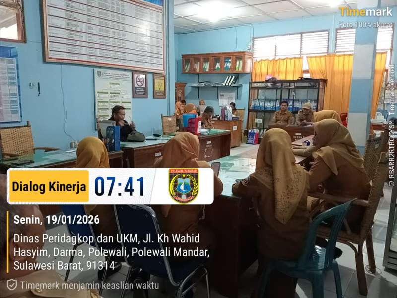 Disperindagkop dan UKM kabupaten Polewali Mandar, Yang dipimpin langsung oleh Sub Kepala Kepegawaian Muhammad Ilham S.Kom,MM Membahas kegiatan tentang pelaksanaan dan absensi OnLine PPPK Paruh Waktu, menghimbau agar semua pegawai PPPK Raruh Waktu Agar Taat jam kerja dan tanggung jawab sesuai dengan tupoksi masing-masing yang bertempat di Ruang Sekretariat Disperindagkop dan UKM, Pada Hari Senin, Tanggal 19 Januari 2026.