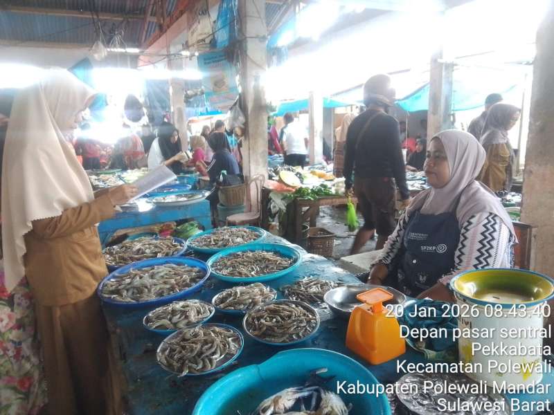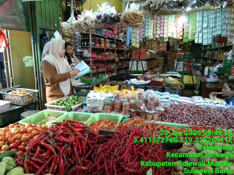 Staf Bidang Perdagangan Dinas Perindagkop dan UKM Melakukan Kegiatan Pemantauan Kebutuhan Bahan Pokok (Bapok) di Pasar Sentral Pekkabata Kabupaten Polewali Mandar, Selasa 20 Januari 2026.