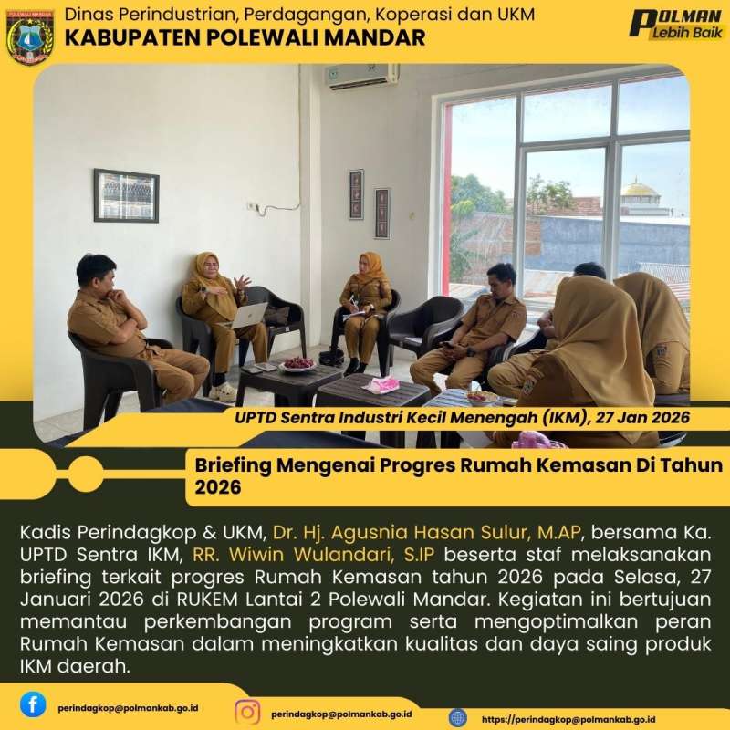 Kadis Perindagkop & UKM, Dr. Hj. Agusnia Hasan Sulur, M.AP, bersama Ka. UPTD Sentra IKM, RR. Wiwin Wulandari, S.IP beserta staf melaksanakan briefing terkait progres Rumah Kemasan tahun 2026 pada Selasa, 27 Januari 2026 di RUKEM Lantai 2 Polewali Mandar. Kegiatan ini bertujuan memantau perkembangan program serta mengoptimalkan peran Rumah Kemasan dalam meningkatkan kualitas dan daya saing produk IKM daerah.