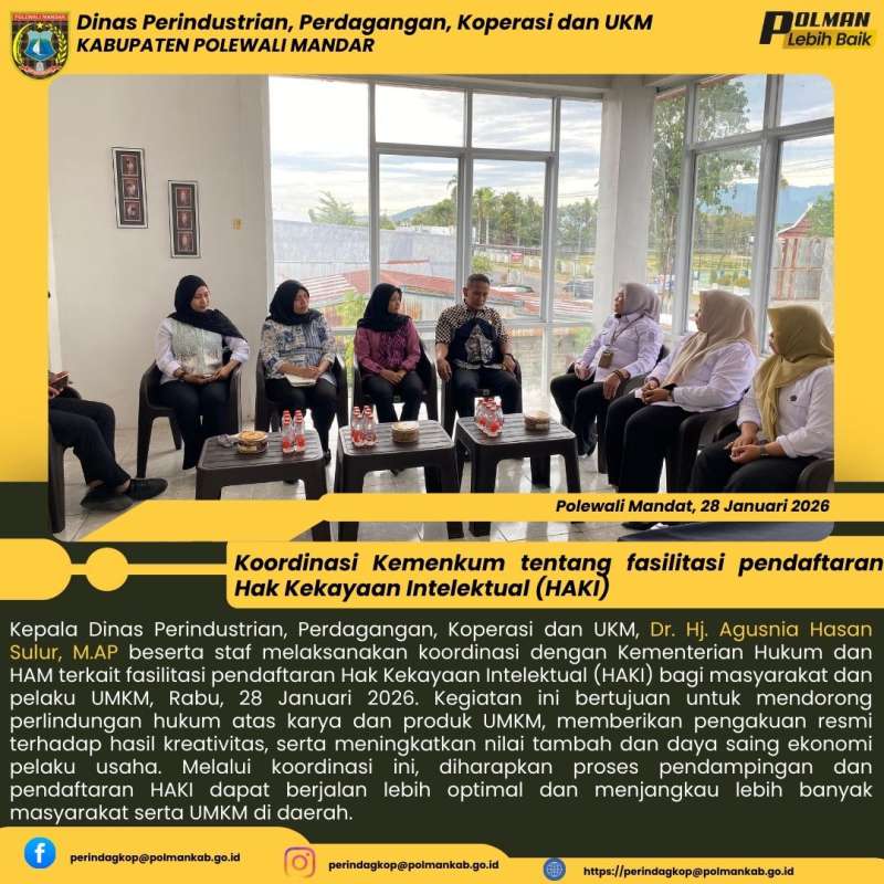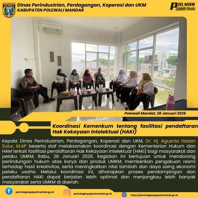 Kepala Dinas Perindustrian, Perdagangan, Koperasi dan UKM, Dr. Hj. Agusnia Hasan Sulur, M.AP beserta staf melaksanakan koordinasi dengan Kementerian Hukum dan HAM terkait fasilitasi pendaftaran Hak Kekayaan Intelektual (HAKI) bagi masyarakat dan pelaku UMKM, Rabu, 28 Januari 2026. Kegiatan ini bertujuan untuk mendorong perlindungan hukum atas karya dan produk UMKM, memberikan pengakuan resmi terhadap hasil kreativitas, serta meningkatkan nilai tambah dan daya saing ekonomi pelaku usaha. Melalui koordinasi ini, diharapkan proses pendampingan dan pendaftaran HAKI dapat berjalan lebih optimal dan menjangkau lebih banyak masyarakat serta UMKM di daerah.