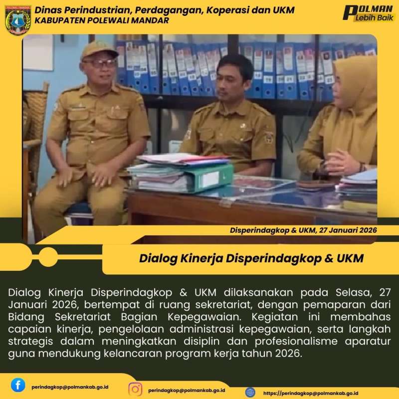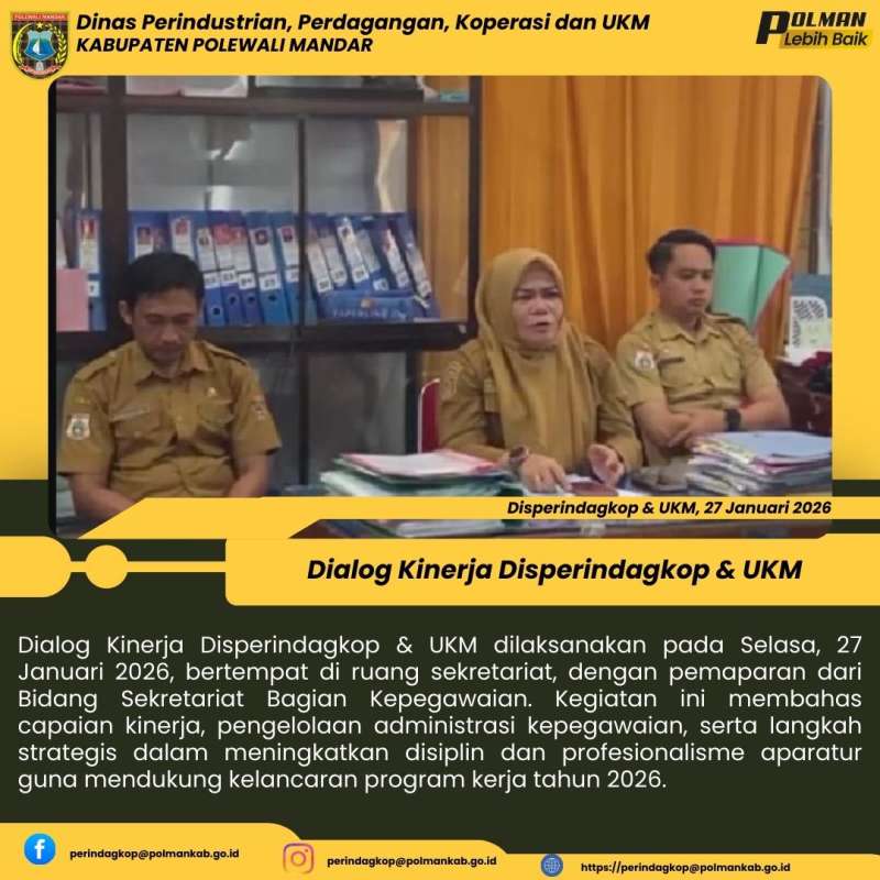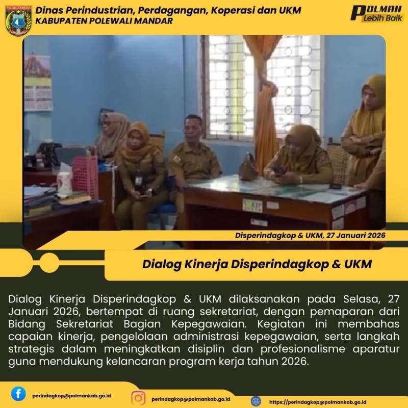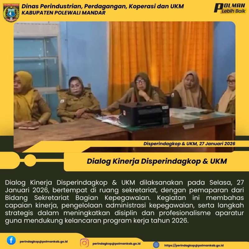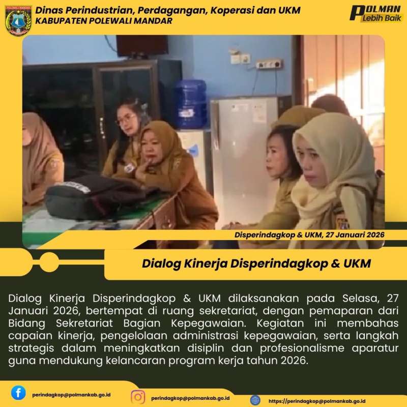 Dialog Kinerja Disperindagkop & UKM dilaksanakan pada Selasa, 27 Januari 2026, bertempat di ruang sekretariat, dengan pemaparan dari Bidang Sekretariat Bagian Kepegawaian. Kegiatan ini membahas capaian kinerja, pengelolaan administrasi kepegawaian, serta langkah strategis dalam meningkatkan disiplin dan profesionalisme aparatur guna mendukung kelancaran program kerja tahun 2026.