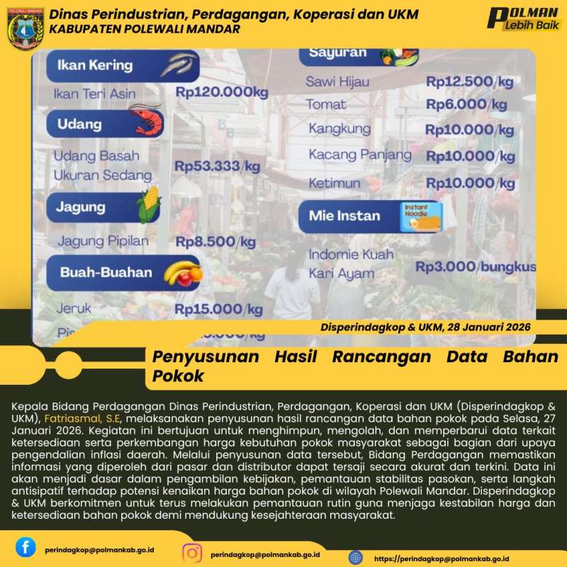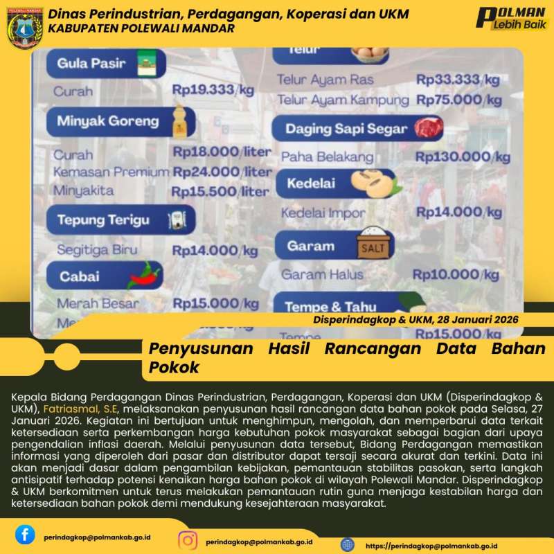 Kepala Bidang Perdagangan Dinas Perindustrian, Perdagangan, Koperasi dan UKM (Disperindagkop & UKM), Fatriasmal, S.E, melaksanakan penyusunan hasil rancangan data bahan pokok pada Selasa, 27 Januari 2026. Kegiatan ini bertujuan untuk menghimpun, mengolah, dan memperbarui data terkait ketersediaan serta perkembangan harga kebutuhan pokok masyarakat sebagai bagian dari upaya pengendalian inflasi daerah. Melalui penyusunan data tersebut, Bidang Perdagangan memastikan informasi yang diperoleh dari pasar dan distributor dapat tersaji secara akurat dan terkini. Data ini akan menjadi dasar dalam pengambilan kebijakan, pemantauan stabilitas pasokan, serta langkah antisipatif terhadap potensi kenaikan harga bahan pokok di wilayah Polewali Mandar. Disperindagkop & UKM berkomitmen untuk terus melakukan pemantauan rutin guna menjaga kestabilan harga dan ketersediaan bahan pokok demi mendukung kesejahteraan masyarakat.