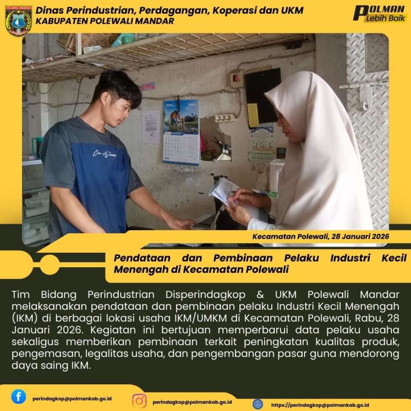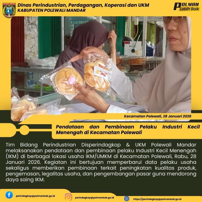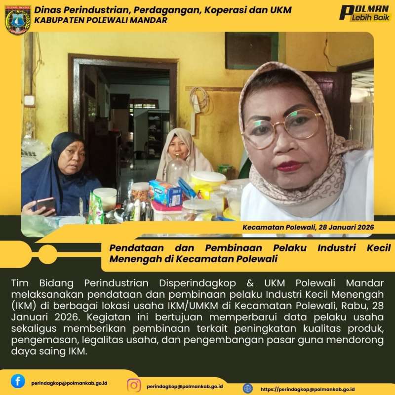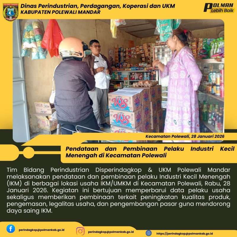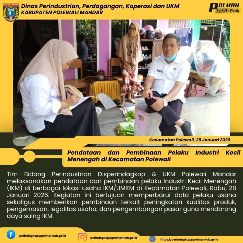 Tim Bidang Perindustrian Disperindagkop & UKM Polewali Mandar melaksanakan pendataan dan pembinaan pelaku Industri Kecil Menengah (IKM) di berbagai lokasi usaha IKM/UMKM di Kecamatan Polewali, Rabu, 28 Januari 2026. Kegiatan ini bertujuan memperbarui data pelaku usaha sekaligus memberikan pembinaan terkait peningkatan kualitas produk, pengemasan, legalitas usaha, dan pengembangan pasar guna mendorong daya saing IKM.