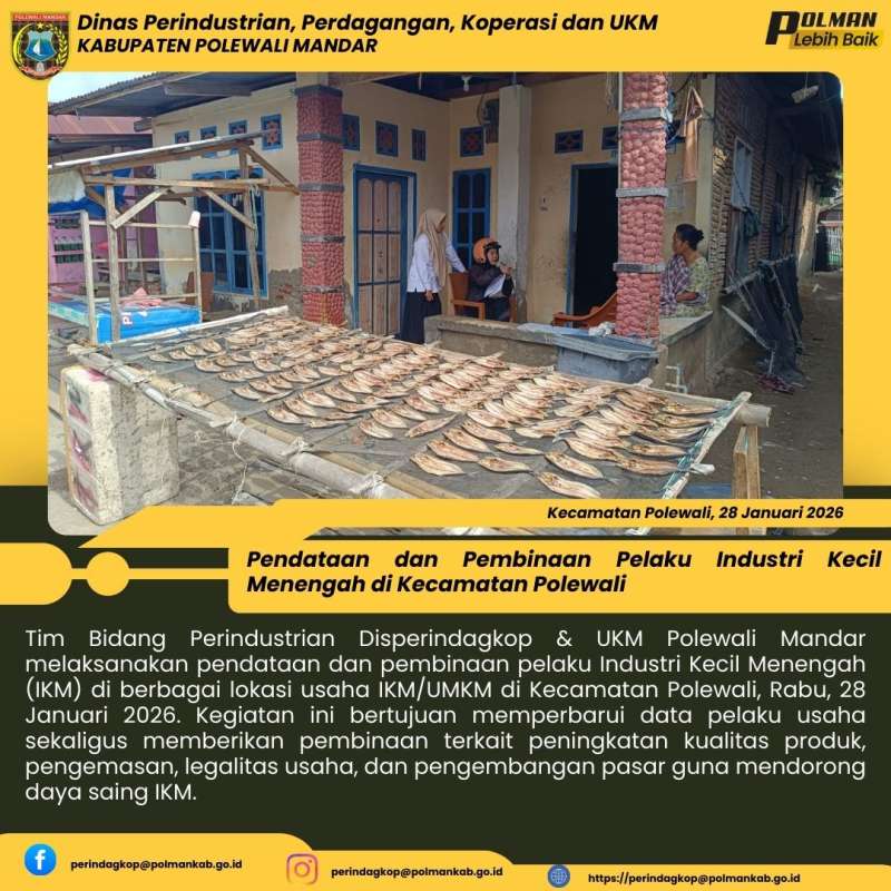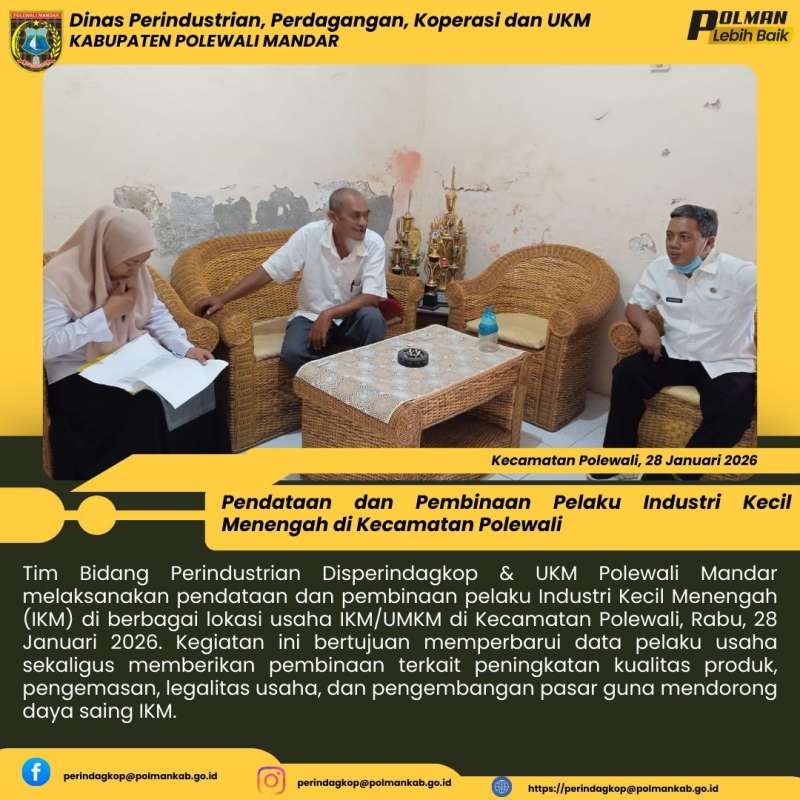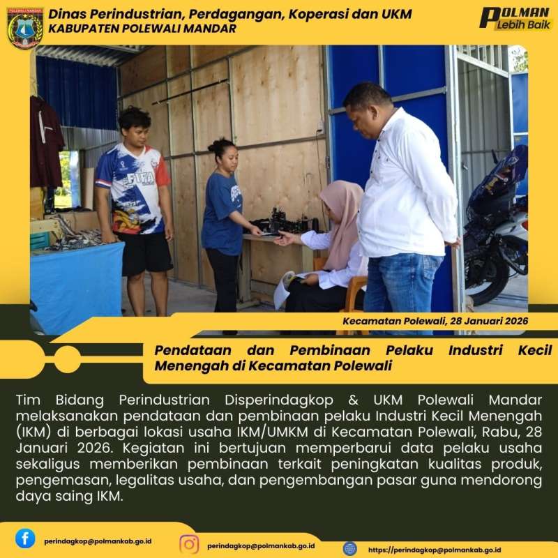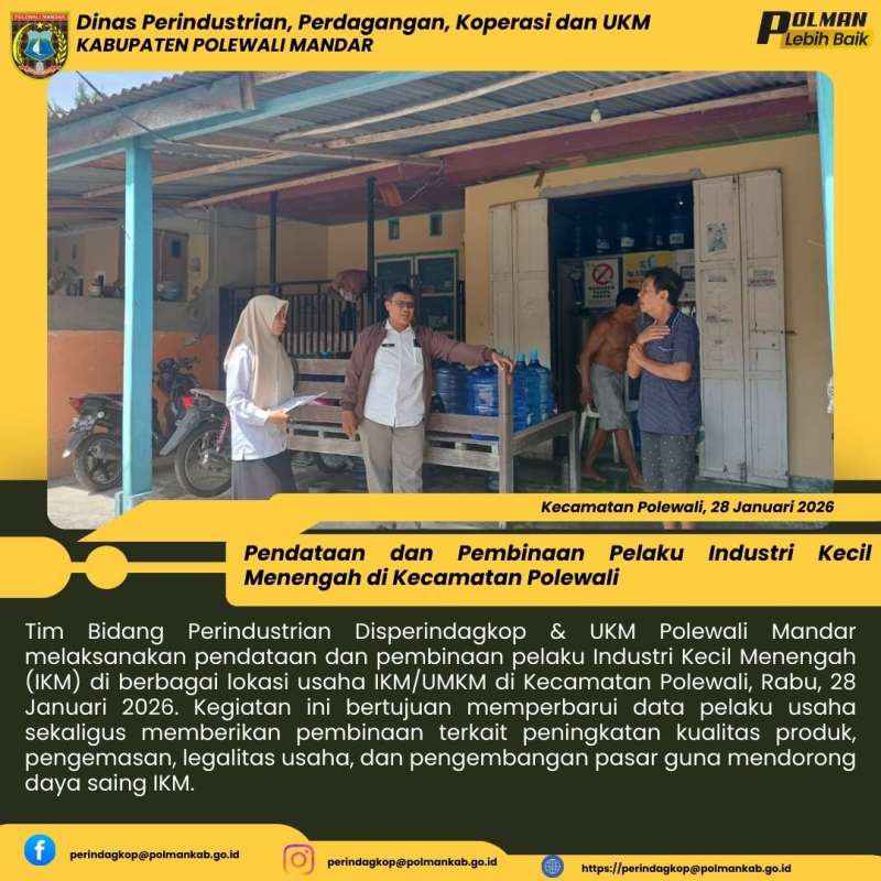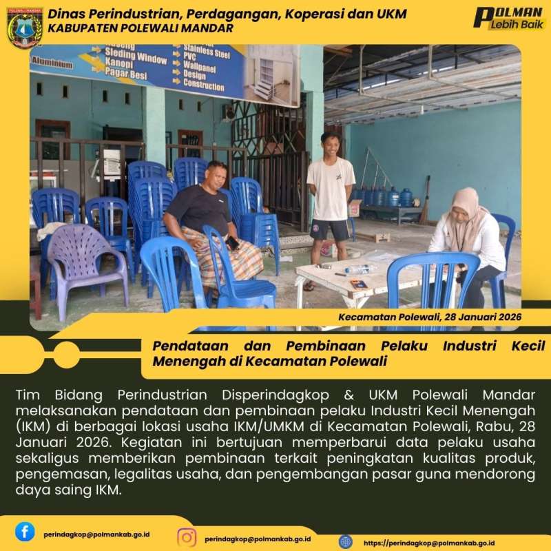 Tim Bidang Perindustrian Disperindagkop & UKM Polewali Mandar melaksanakan pendataan dan pembinaan pelaku Industri Kecil Menengah (IKM) di berbagai lokasi usaha IKM/UMKM di Kecamatan Polewali, Rabu, 28 Januari 2026. Kegiatan ini bertujuan memperbarui data pelaku usaha sekaligus memberikan pembinaan terkait peningkatan kualitas produk, pengemasan, legalitas usaha, dan pengembangan pasar guna mendorong daya saing IKM.