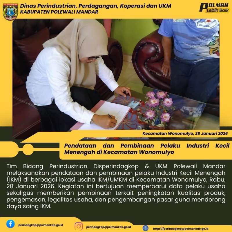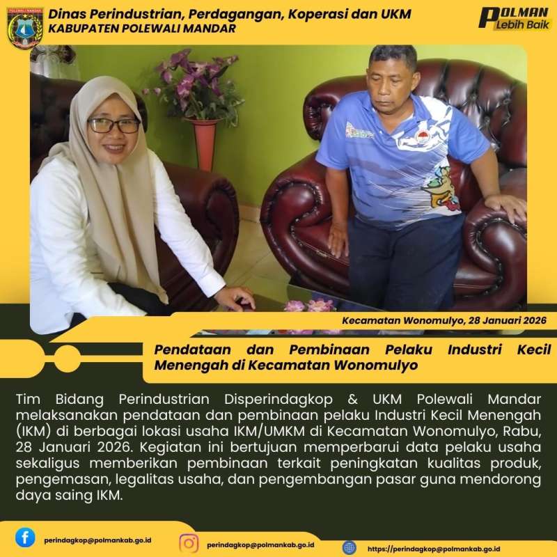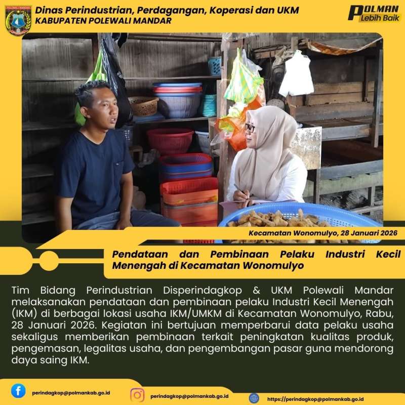 Tim Bidang Perindustrian Disperindagkop & UKM Polewali Mandar melaksanakan pendataan dan pembinaan pelaku Industri Kecil Menengah (IKM) di berbagai lokasi usaha IKM/UMKM di Kecamatan Wonomulyo, Rabu, 28 Januari 2026. Kegiatan ini bertujuan memperbarui data pelaku usaha sekaligus memberikan pembinaan terkait peningkatan kualitas produk, pengemasan, legalitas usaha, dan pengembangan pasar guna mendorong daya saing IKM.