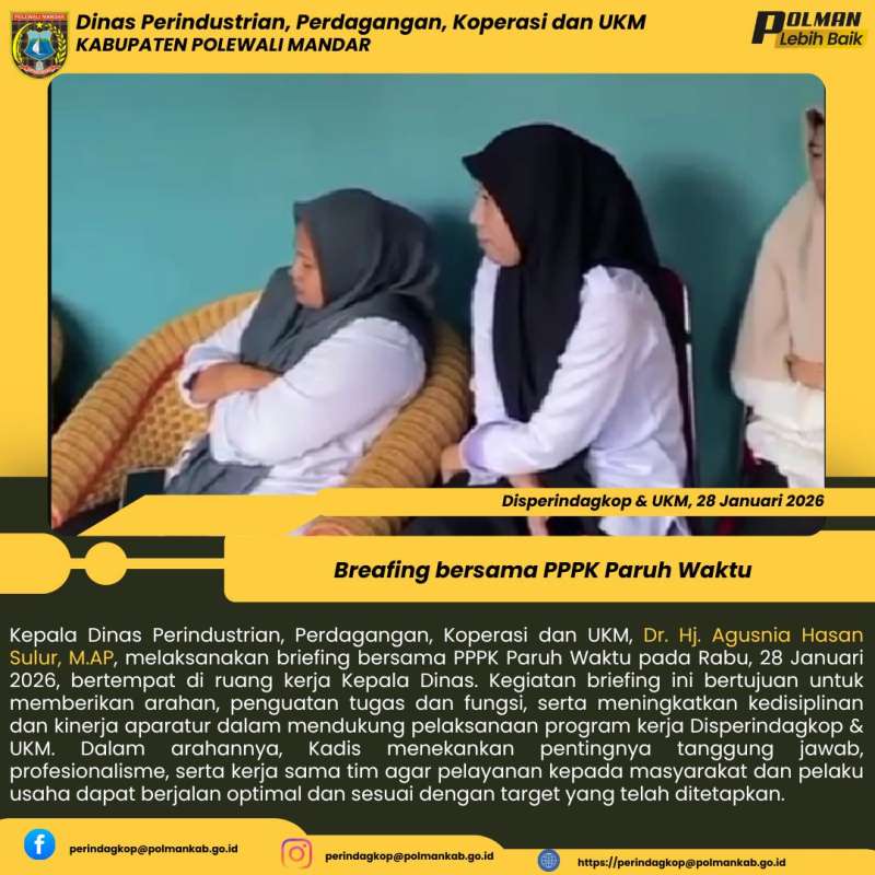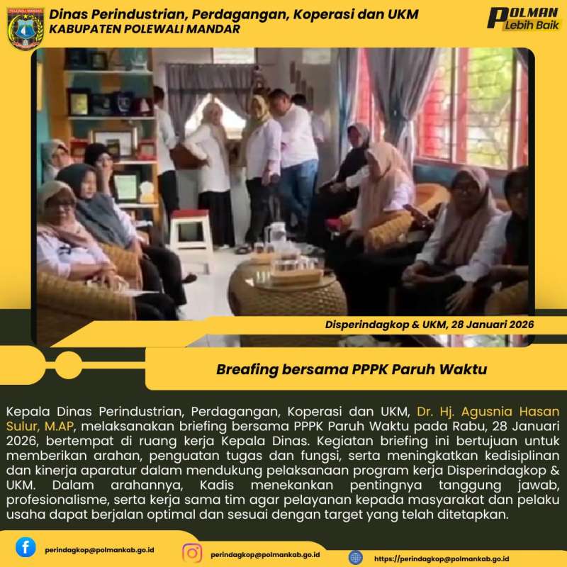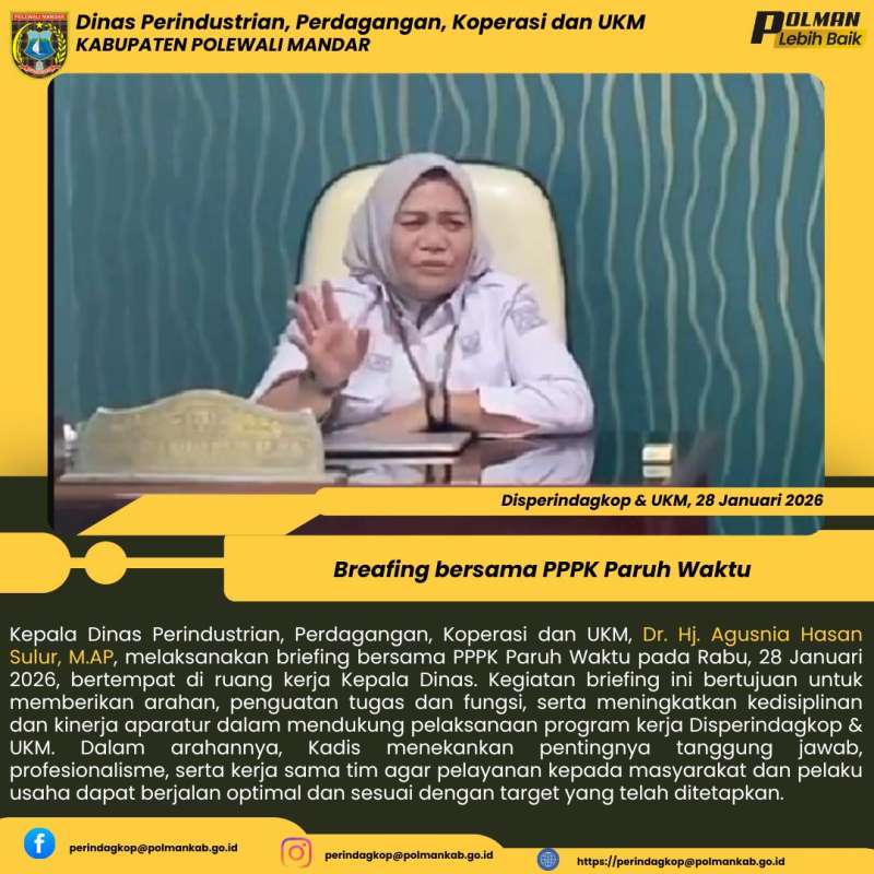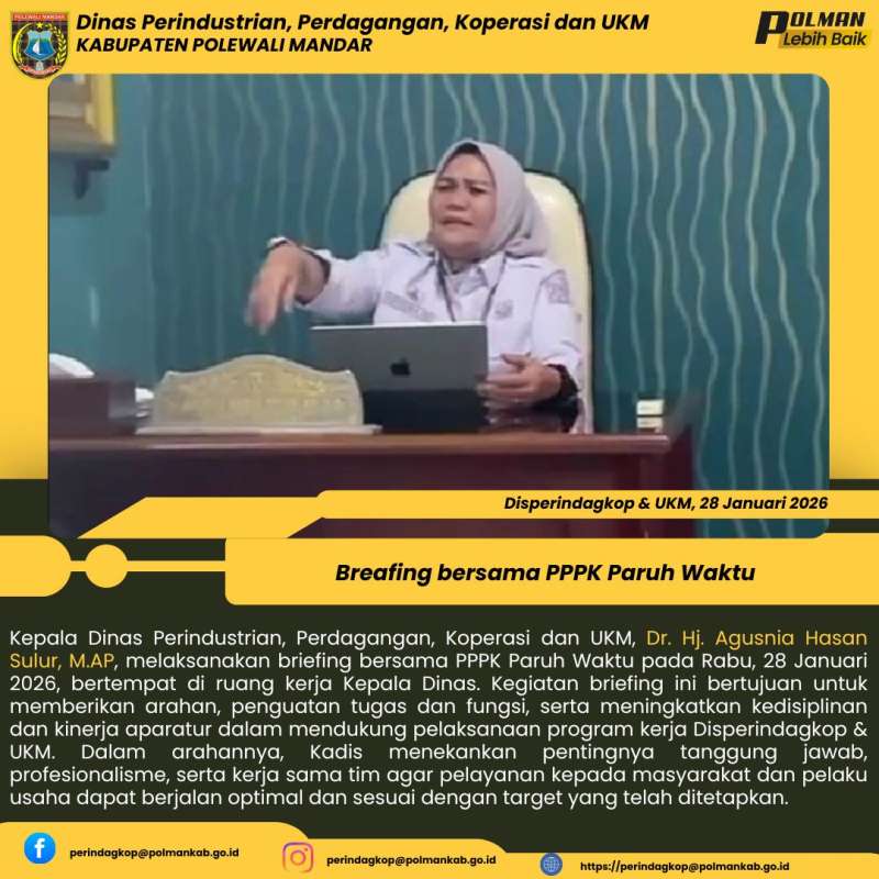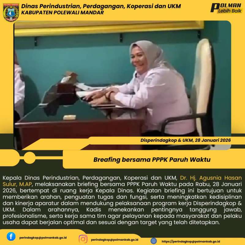 Kepala Dinas Perindustrian, Perdagangan, Koperasi dan UKM, Dr. Hj. Agusnia Hasan Sulur, M.AP, melaksanakan briefing bersama PPPK Paruh Waktu pada Rabu, 28 Januari 2026, bertempat di ruang kerja Kepala Dinas. Kegiatan briefing ini bertujuan untuk memberikan arahan, penguatan tugas dan fungsi, serta meningkatkan kedisiplinan dan kinerja aparatur dalam mendukung pelaksanaan program kerja Disperindagkop & UKM. Dalam arahannya, Kadis menekankan pentingnya tanggung jawab, profesionalisme, serta kerja sama tim agar pelayanan kepada masyarakat dan pelaku usaha dapat berjalan optimal dan sesuai dengan target yang telah ditetapkan.