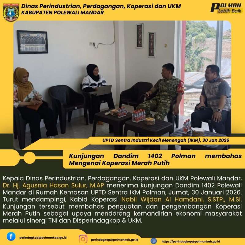 Kepala Dinas Perindustrian, Perdagangan, Koperasi dan UKM Polewali Mandar, Dr. Hj. Agusnia Hasan Sulur, M.AP menerima kunjungan Dandim 1402 Polewali Mandar di Rumah Kemasan UPTD Sentra IKM Polman, Jumat, 30 Januari 2026. Turut mendampingi, Kabid Koperasi Nabil Wijdan Al Hamdani, S.STP., M.Si. Kunjungan tersebut membahas penguatan dan pengembangan Koperasi Merah Putih sebagai upaya mendorong kemandirian ekonomi masyarakat melalui sinergi TNI dan Disperindagkop & UKM.