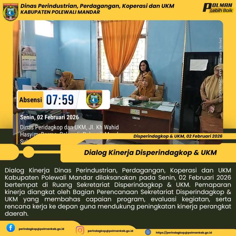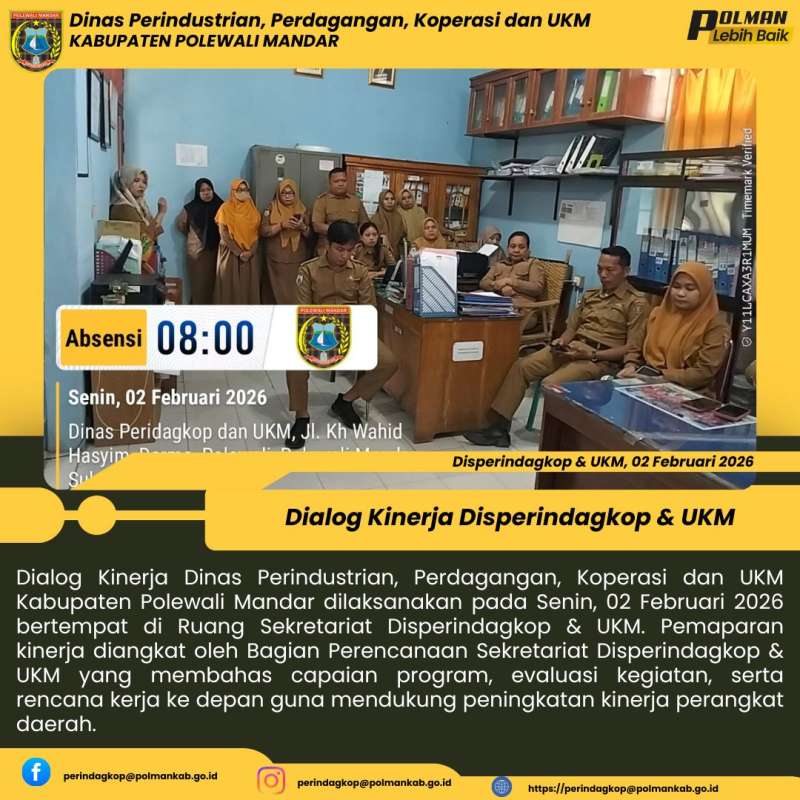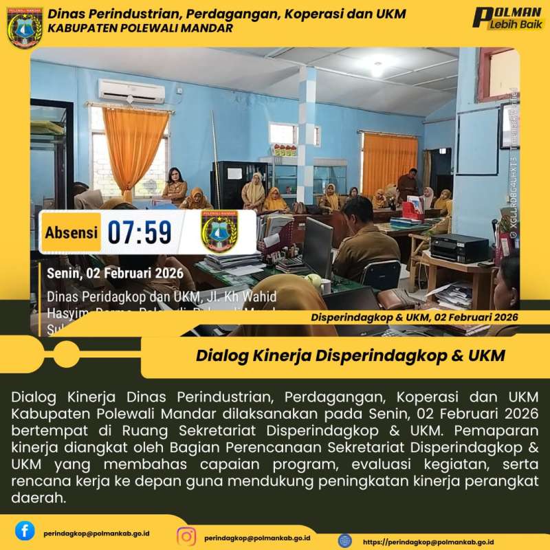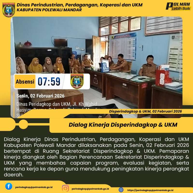 Dialog Kinerja Dinas Perindustrian, Perdagangan, Koperasi dan UKM Kabupaten Polewali Mandar dilaksanakan pada Senin, 02 Februari 2026 bertempat di Ruang Sekretariat Disperindagkop & UKM. Pemaparan kinerja diangkat oleh Bagian Perencanaan Sekretariat Disperindagkop & UKM yang membahas capaian program, evaluasi kegiatan, serta rencana kerja ke depan guna mendukung peningkatan kinerja perangkat daerah.