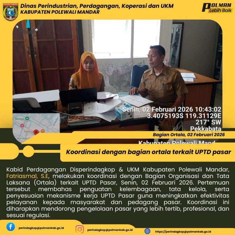 Kabid Perdagangan Disperindagkop & UKM Kabupaten Polewali Mandar, Fatriasmal, S.E, melakukan koordinasi dengan Bagian Organisasi dan Tata Laksana (Ortala) terkait UPTD Pasar, Senin, 02 Februari 2026. Pertemuan tersebut membahas penguatan kelembagaan, tata kelola, serta penyesuaian mekanisme kerja UPTD Pasar guna meningkatkan efektivitas pelayanan kepada masyarakat dan pedagang pasar. Koordinasi ini diharapkan mendorong pengelolaan pasar yang lebih tertib, profesional, dan sesuai regulasi.