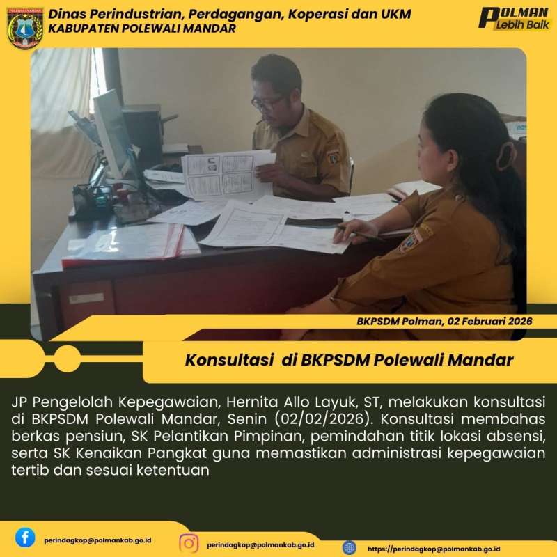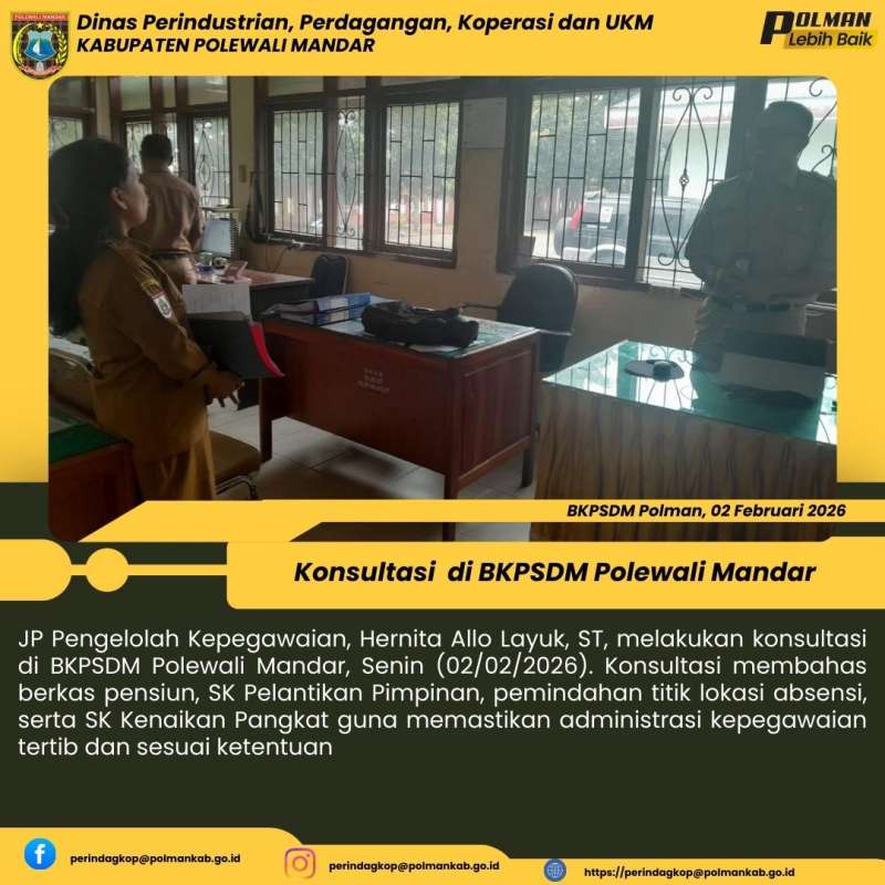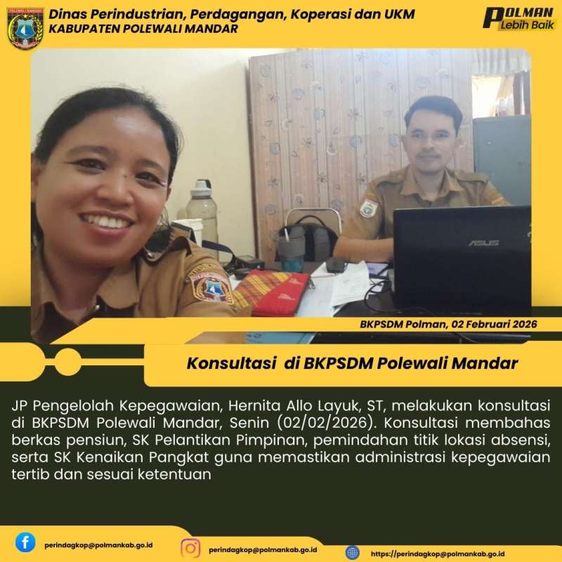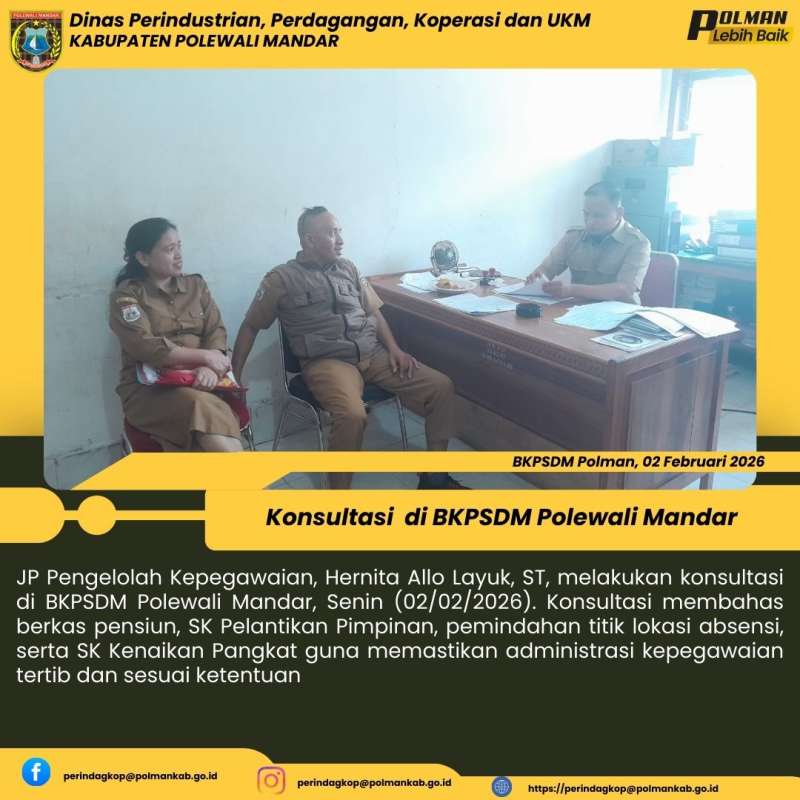 JP Pengelolah Kepegawaian, Hernita Allo Layuk, ST, melakukan konsultasi di BKPSDM Polewali Mandar, Senin (02/02/2026). Konsultasi membahas berkas pensiun, SK Pelantikan Pimpinan, pemindahan titik lokasi absensi, serta SK Kenaikan Pangkat guna memastikan administrasi kepegawaian tertib dan sesuai ketentuan