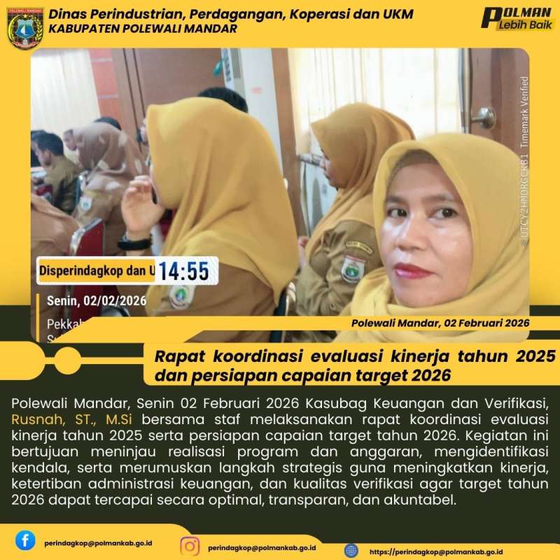 Polewali Mandar, Senin 02 Februari 2026 Kasubag Keuangan dan Verifikasi, Rusnah, ST., M.Si bersama staf melaksanakan rapat koordinasi evaluasi kinerja tahun 2025 serta persiapan capaian target tahun 2026. Kegiatan ini bertujuan meninjau realisasi program dan anggaran, mengidentifikasi kendala, serta merumuskan langkah strategis guna meningkatkan kinerja, ketertiban administrasi keuangan, dan kualitas verifikasi agar target tahun 2026 dapat tercapai secara optimal, transparan, dan akuntabel.
