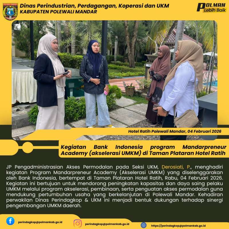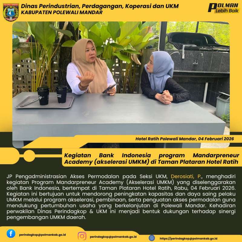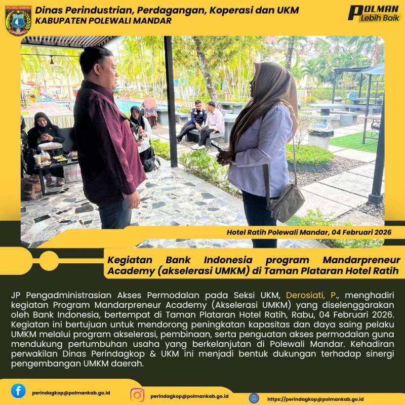 JP Pengadministrasian Akses Permodalan pada Seksi UKM, Derosiati, P., menghadiri kegiatan Program Mandarpreneur Academy (Akselerasi UMKM) yang diselenggarakan oleh Bank Indonesia, bertempat di Taman Plataran Hotel Ratih, Rabu, 04 Februari 2026. Kegiatan ini bertujuan untuk mendorong peningkatan kapasitas dan daya saing pelaku UMKM melalui program akselerasi, pembinaan, serta penguatan akses permodalan guna mendukung pertumbuhan usaha yang berkelanjutan di Polewali Mandar. Kehadiran perwakilan Dinas Perindagkop & UKM ini menjadi bentuk dukungan terhadap sinergi pengembangan UMKM daerah.