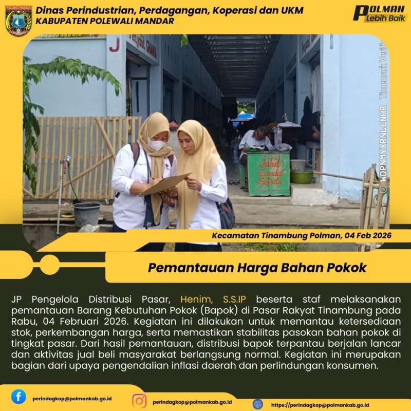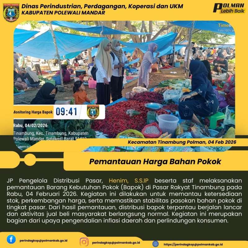 JP Pengelola Distribusi Pasar, Henim, S.S.IP beserta staf melaksanakan pemantauan Barang Kebutuhan Pokok (Bapok) di Pasar Rakyat Tinambung pada Rabu, 04 Februari 2026. Kegiatan ini dilakukan untuk memantau ketersediaan stok, perkembangan harga, serta memastikan stabilitas pasokan bahan pokok di tingkat pasar. Dari hasil pemantauan, distribusi bapok terpantau berjalan lancar dan aktivitas jual beli masyarakat berlangsung normal. Kegiatan ini merupakan bagian dari upaya pengendalian inflasi daerah dan perlindungan konsumen.