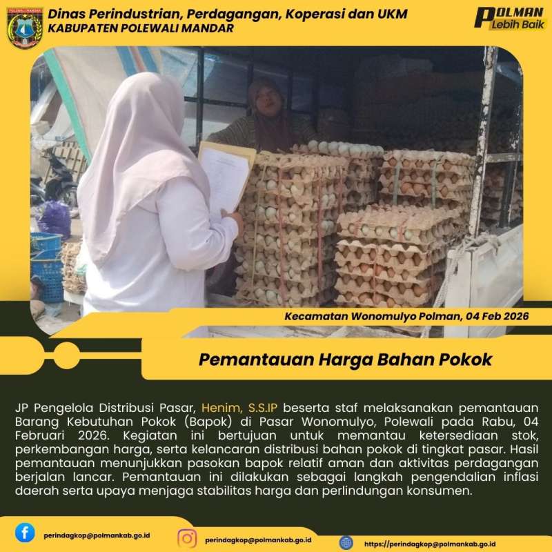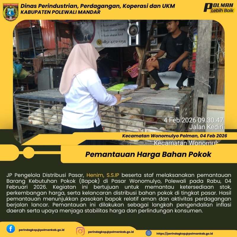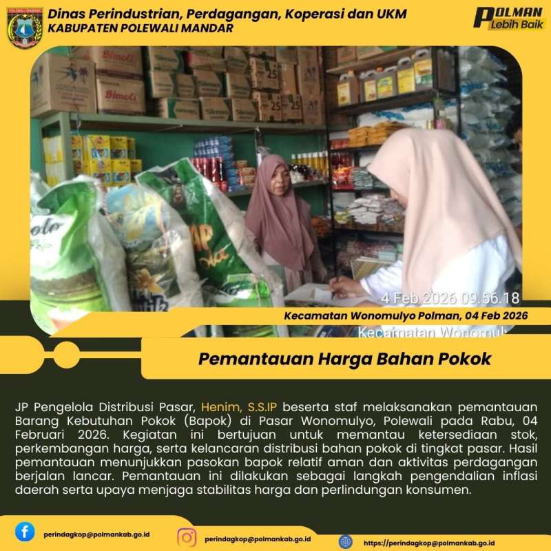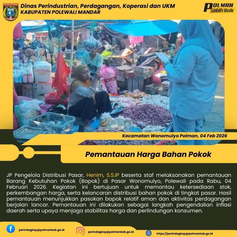 JP Pengelola Distribusi Pasar, Henim, S.S.IP beserta staf melaksanakan pemantauan Barang Kebutuhan Pokok (Bapok) di Pasar Wonomulyo, Polewali pada Rabu, 04 Februari 2026. Kegiatan ini bertujuan untuk memantau ketersediaan stok, perkembangan harga, serta kelancaran distribusi bahan pokok di tingkat pasar. Hasil pemantauan menunjukkan pasokan bapok relatif aman dan aktivitas perdagangan berjalan lancar. Pemantauan ini dilakukan sebagai langkah pengendalian inflasi daerah serta upaya menjaga stabilitas harga dan perlindungan konsumen.