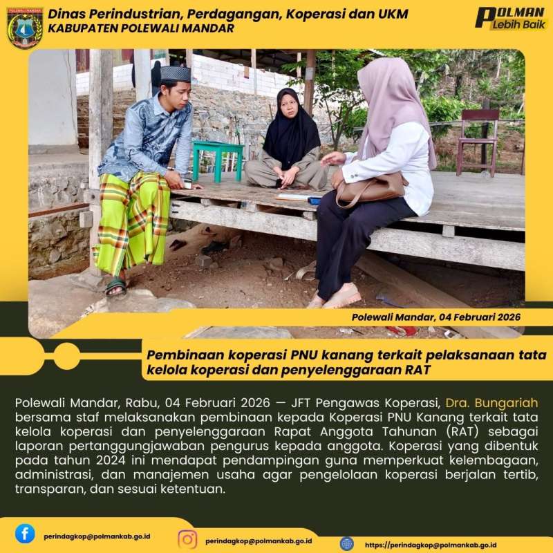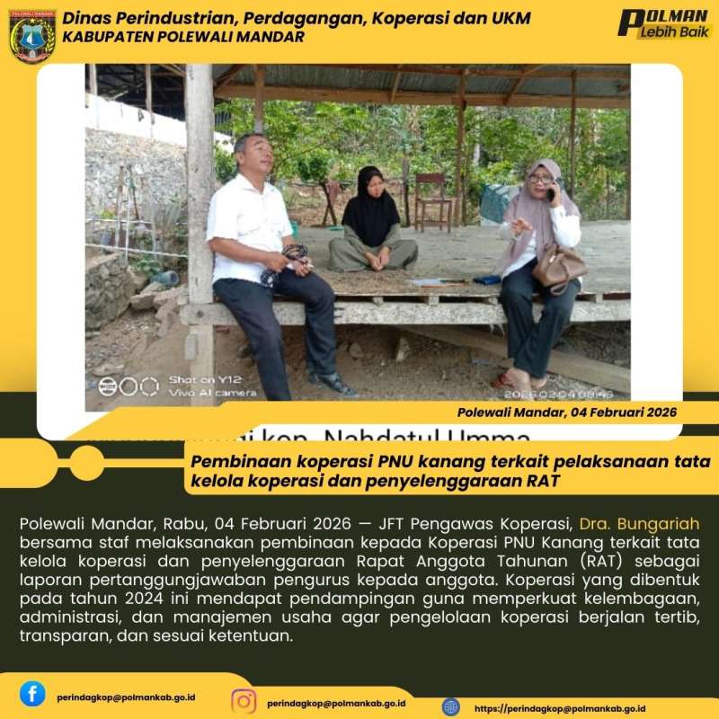 Polewali Mandar, Rabu, 04 Februari 2026 — JFT Pengawas Koperasi, Dra. Bungariah bersama staf melaksanakan pembinaan kepada Koperasi PNU Kanang terkait tata kelola koperasi dan penyelenggaraan Rapat Anggota Tahunan (RAT) sebagai laporan pertanggungjawaban pengurus kepada anggota. Koperasi yang dibentuk pada tahun 2024 ini mendapat pendampingan guna memperkuat kelembagaan, administrasi, dan manajemen usaha agar pengelolaan koperasi berjalan tertib, transparan, dan sesuai ketentuan.