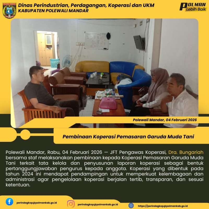 Polewali Mandar, Rabu, 04 Februari 2026 — JFT Pengawas Koperasi, Dra. Bungariah bersama staf melaksanakan pembinaan kepada Koperasi Pemasaran Garuda Muda Tani terkait tata kelola dan penyusunan laporan koperasi sebagai bentuk pertanggungjawaban pengurus kepada anggota. Koperasi yang dibentuk pada tahun 2024 ini mendapat pendampingan untuk memperkuat kelembagaan dan administrasi agar pengelolaan koperasi berjalan tertib, transparan, dan sesuai ketentuan.