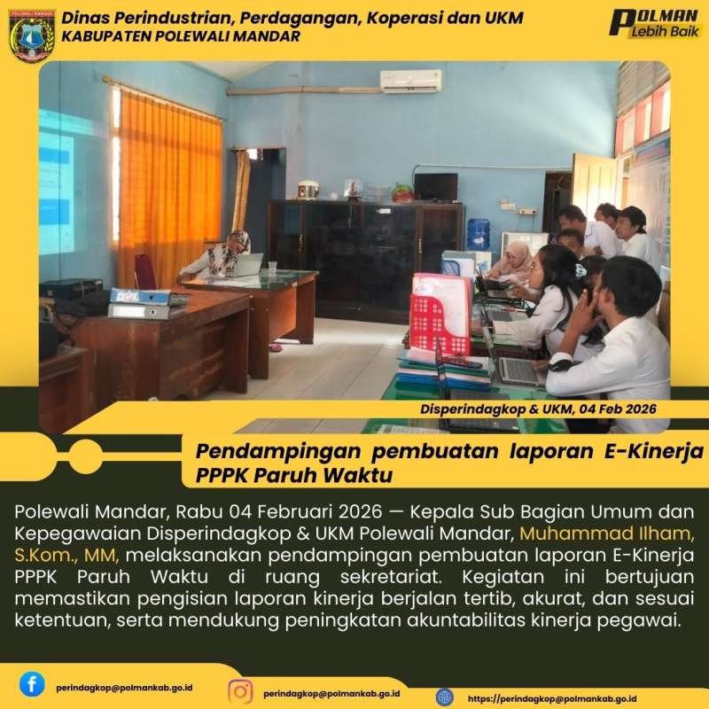 Polewali Mandar, Rabu 04 Februari 2026 — Kepala Sub Bagian Umum dan Kepegawaian Disperindagkop & UKM Polewali Mandar, Muhammad Ilham, S.Kom., MM, melaksanakan pendampingan pembuatan laporan E-Kinerja PPPK Paruh Waktu di ruang sekretariat. Kegiatan ini bertujuan memastikan pengisian laporan kinerja berjalan tertib, akurat, dan sesuai ketentuan, serta mendukung peningkatan akuntabilitas kinerja pegawai.