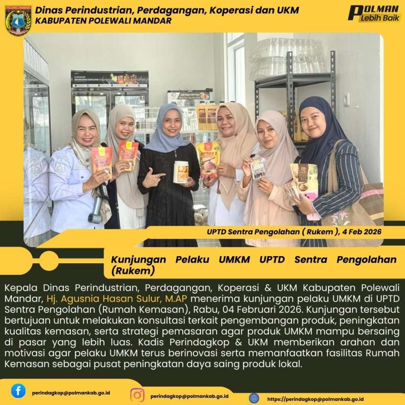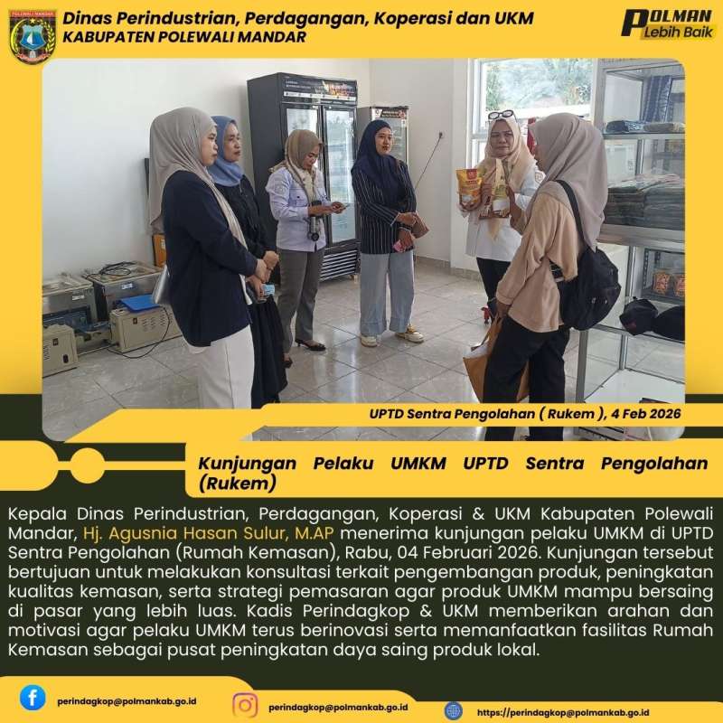 Kepala Dinas Perindustrian, Perdagangan, Koperasi & UKM Kabupaten Polewali Mandar, Hj. Agusnia Hasan Sulur, M.AP menerima kunjungan pelaku UMKM di UPTD Sentra Pengolahan (Rumah Kemasan), Rabu, 04 Februari 2026. Kunjungan tersebut bertujuan untuk melakukan konsultasi terkait pengembangan produk, peningkatan kualitas kemasan, serta strategi pemasaran agar produk UMKM mampu bersaing di pasar yang lebih luas. Kadis Perindagkop & UKM memberikan arahan dan motivasi agar pelaku UMKM terus berinovasi serta memanfaatkan fasilitas Rumah Kemasan sebagai pusat peningkatan daya saing produk lokal.