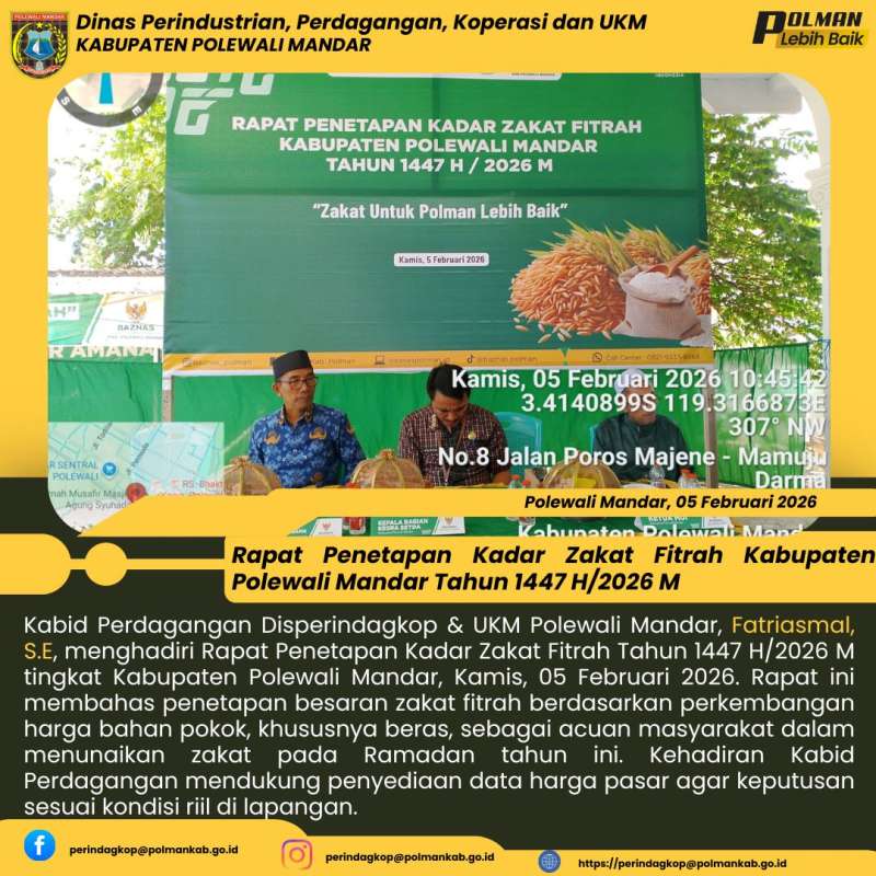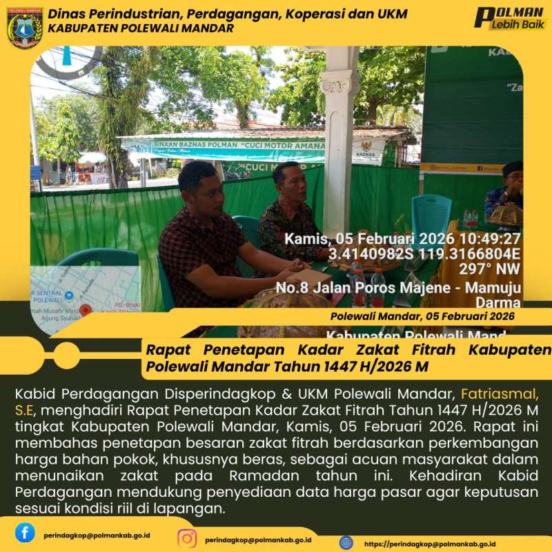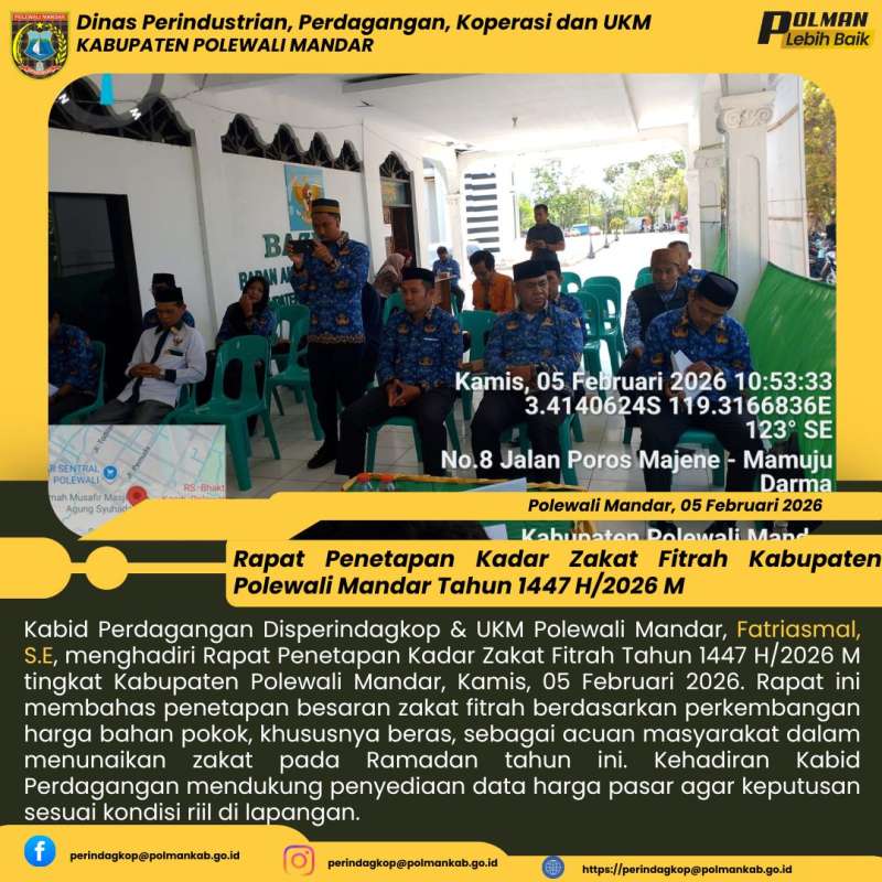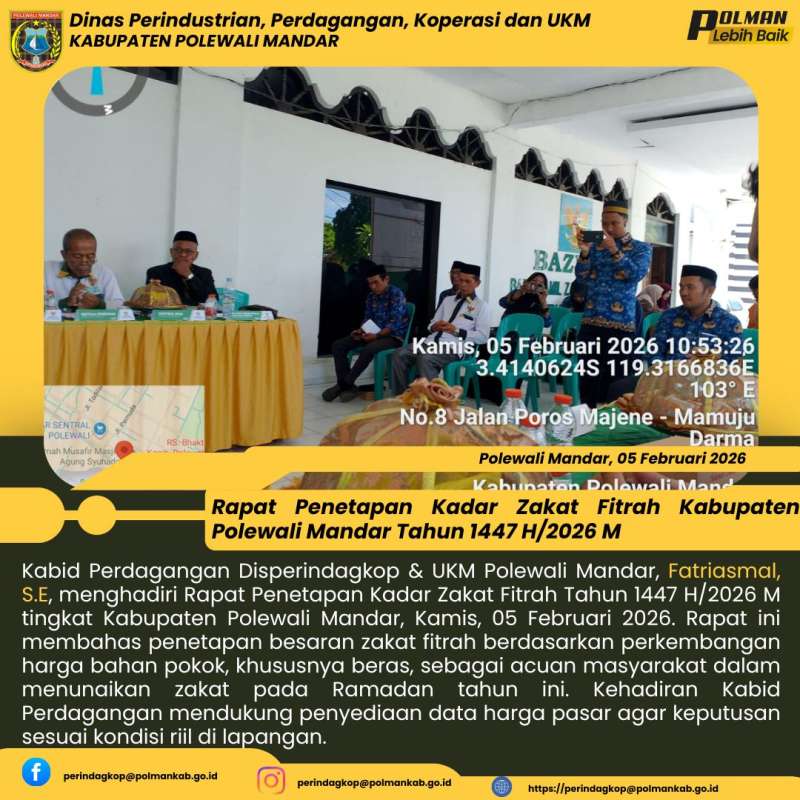 Kabid Perdagangan Disperindagkop & UKM Polewali Mandar, Fatriasmal, S.E, menghadiri Rapat Penetapan Kadar Zakat Fitrah Tahun 1447 H/2026 M tingkat Kabupaten Polewali Mandar, Kamis, 05 Februari 2026. Rapat ini membahas penetapan besaran zakat fitrah berdasarkan perkembangan harga bahan pokok, khususnya beras, sebagai acuan masyarakat dalam menunaikan zakat pada Ramadan tahun ini. Kehadiran Kabid Perdagangan mendukung penyediaan data harga pasar agar keputusan sesuai kondisi riil di lapangan.