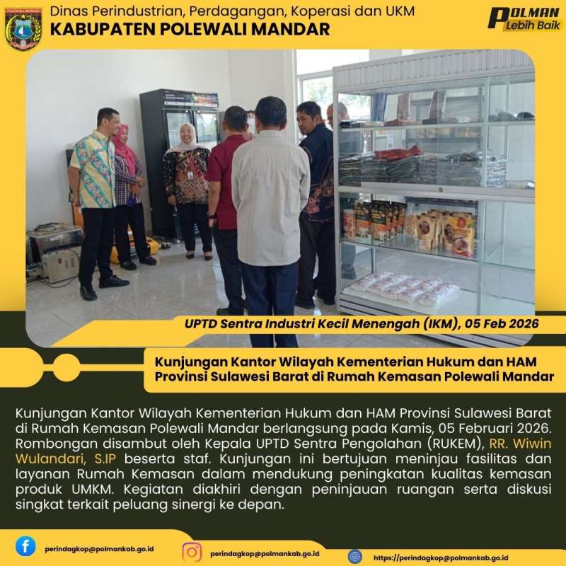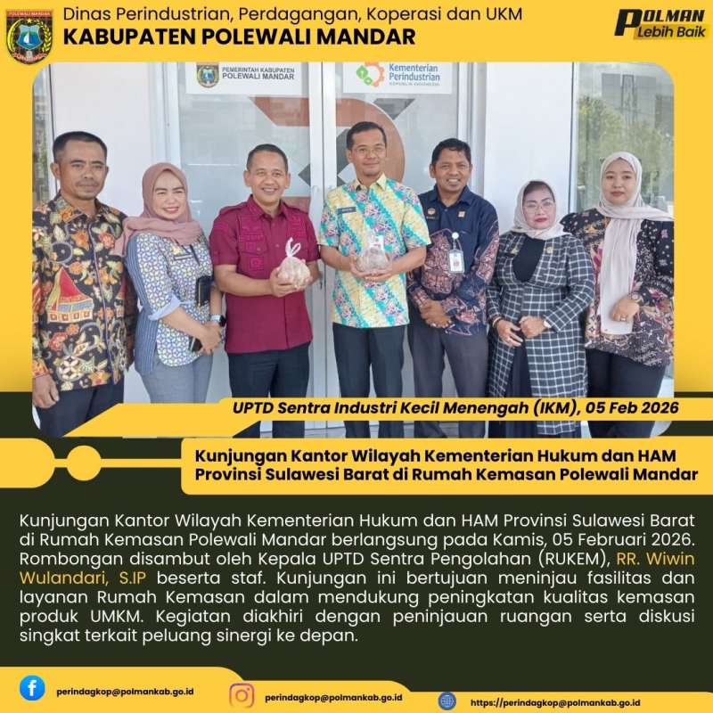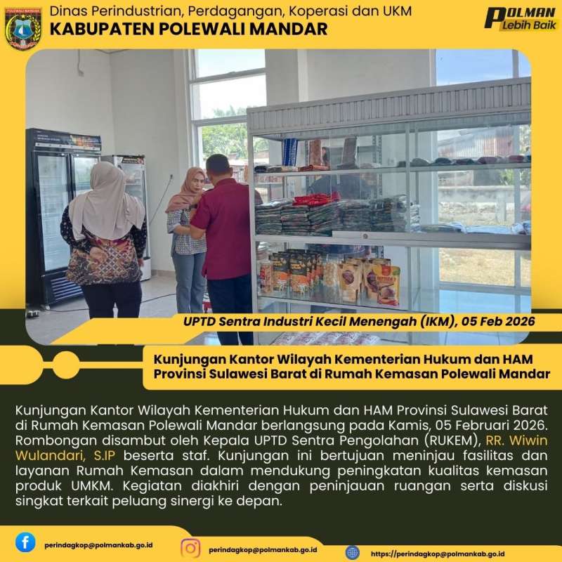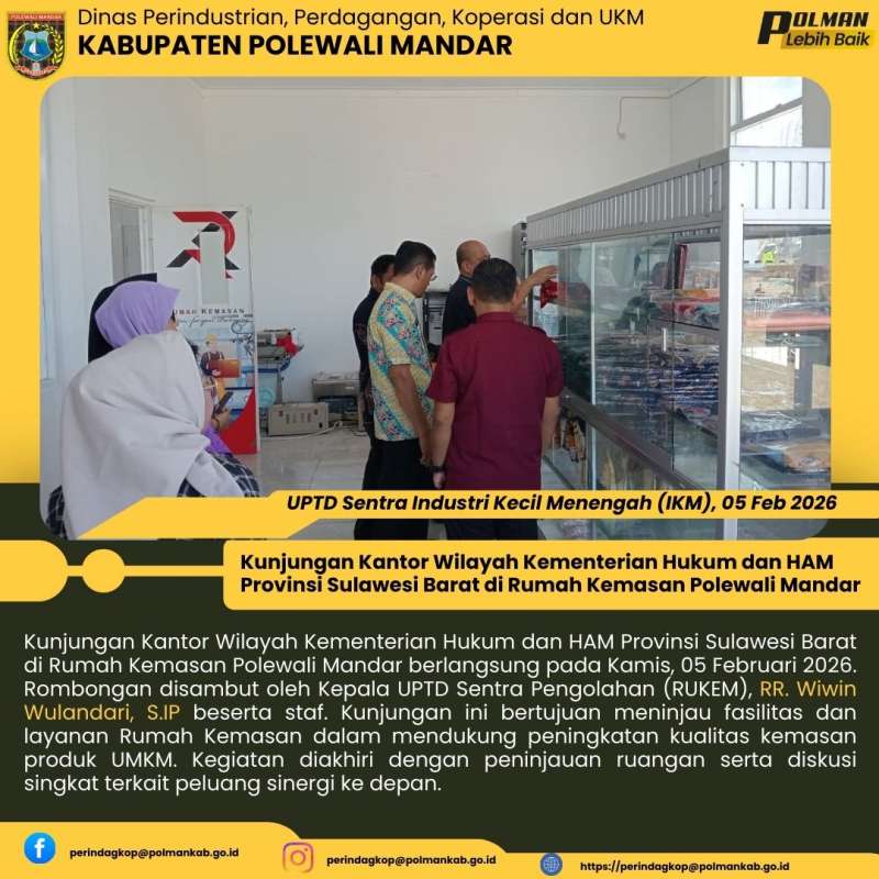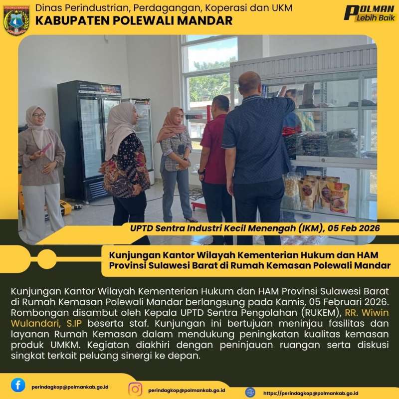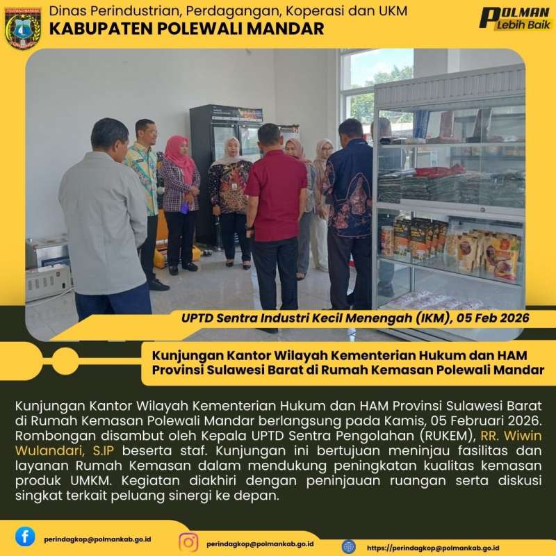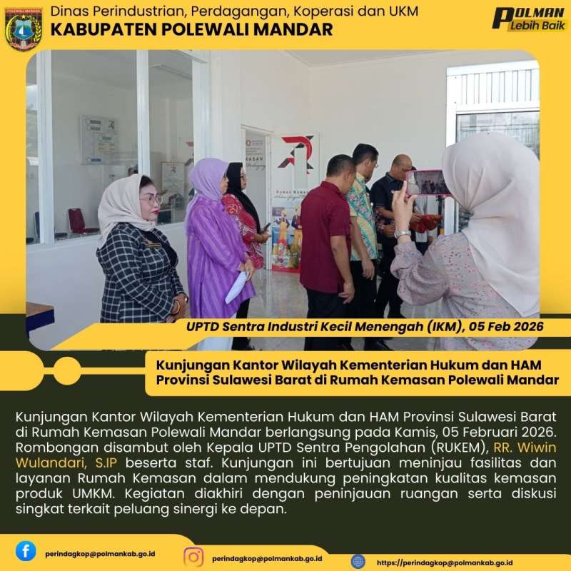 Kunjungan Kantor Wilayah Kementerian Hukum dan HAM Provinsi Sulawesi Barat di Rumah Kemasan Polewali Mandar berlangsung pada Kamis, 05 Februari 2026. Rombongan disambut oleh Kepala UPTD Sentra Pengolahan (RUKEM), RR. Wiwin Wulandari, S.IP beserta staf. Kunjungan ini bertujuan meninjau fasilitas dan layanan Rumah Kemasan dalam mendukung peningkatan kualitas kemasan produk UMKM. Kegiatan diakhiri dengan peninjauan ruangan serta diskusi singkat terkait peluang sinergi ke depan.