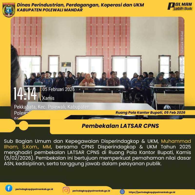 Sub Bagian Umum dan Kepegawaian Disperindagkop & UKM, Muhammad Ilham, S.Kom., MM, bersama CPNS Disperindagkop & UKM Tahun 2025 menghadiri pembekalan LATSAR CPNS di Ruang Pola Kantor Bupati, Kamis (5/02/2026). Pembekalan ini bertujuan memperkuat pemahaman nilai dasar ASN, kedisiplinan, serta tanggung jawab dalam pelayanan publik.