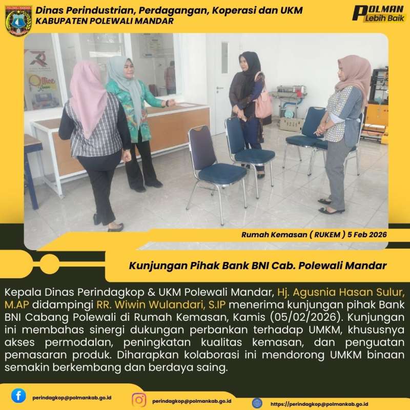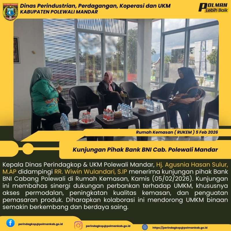 Kepala Dinas Perindagkop & UKM Polewali Mandar, Hj. Agusnia Hasan Sulur, M.AP didampingi RR. Wiwin Wulandari, S.IP menerima kunjungan pihak Bank BNI Cabang Polewali di Rumah Kemasan, Kamis (05/02/2026). Kunjungan ini membahas sinergi dukungan perbankan terhadap UMKM, khususnya akses permodalan, peningkatan kualitas kemasan, dan penguatan pemasaran produk. Diharapkan kolaborasi ini mendorong UMKM binaan semakin berkembang dan berdaya saing.