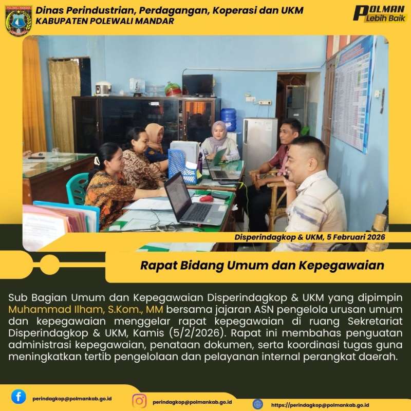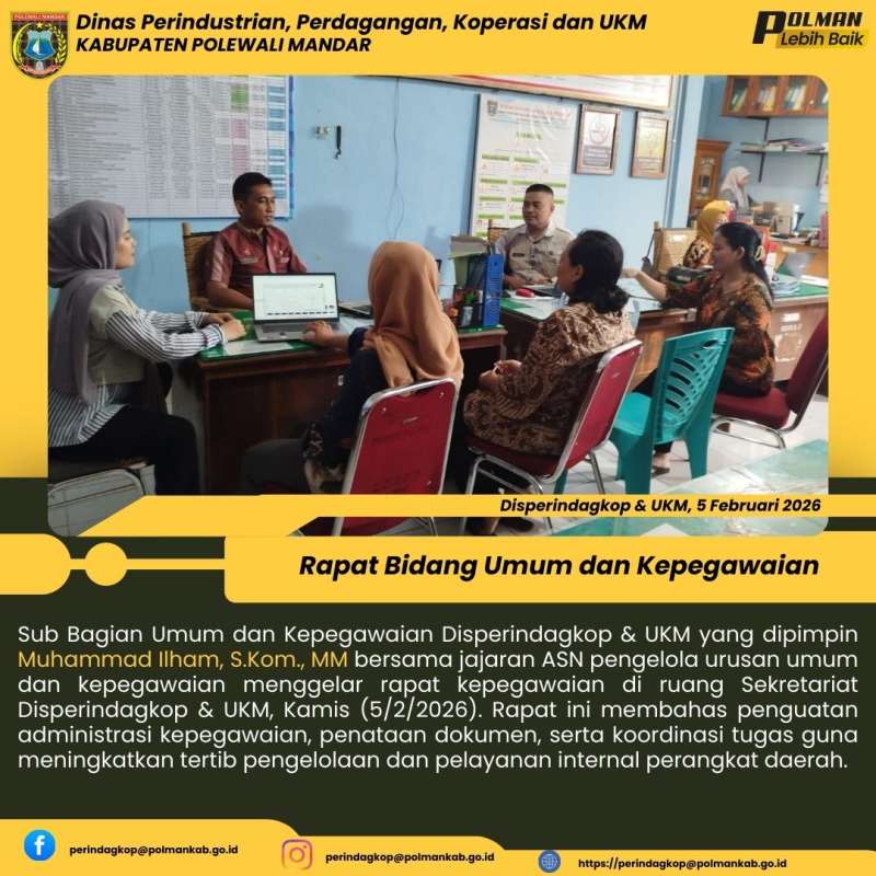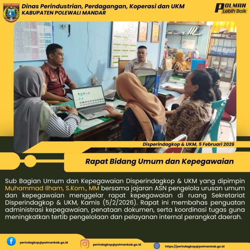 Sub Bagian Umum dan Kepegawaian Disperindagkop & UKM yang dipimpin Muhammad Ilham, S.Kom., MM bersama jajaran ASN pengelola urusan umum dan kepegawaian menggelar rapat kepegawaian di ruang Sekretariat Disperindagkop & UKM, Kamis (5/2/2026). Rapat ini membahas penguatan administrasi kepegawaian, penataan dokumen, serta koordinasi tugas guna meningkatkan tertib pengelolaan dan pelayanan internal perangkat daerah.