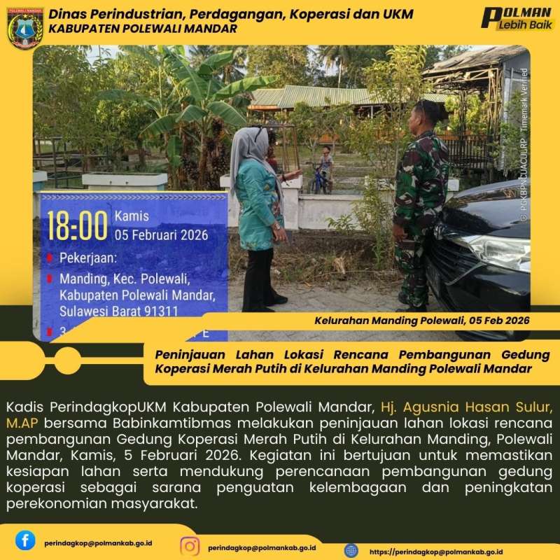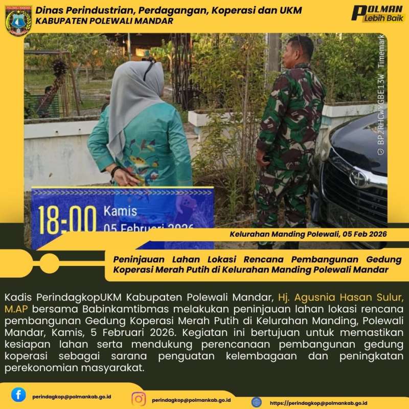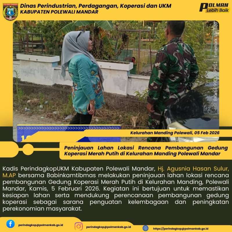 Kadis PerindagkopUKM Kabupaten Polewali Mandar, Hj. Agusnia Hasan Sulur, M.AP bersama Babinkamtibmas melakukan peninjauan lahan lokasi rencana pembangunan Gedung Koperasi Merah Putih di Kelurahan Manding, Polewali Mandar, Kamis, 5 Februari 2026. Kegiatan ini bertujuan untuk memastikan kesiapan lahan serta mendukung perencanaan pembangunan gedung koperasi sebagai sarana penguatan kelembagaan dan peningkatan perekonomian masyarakat.