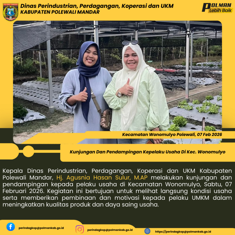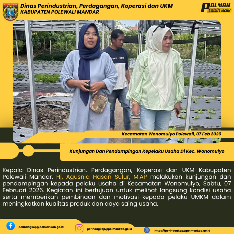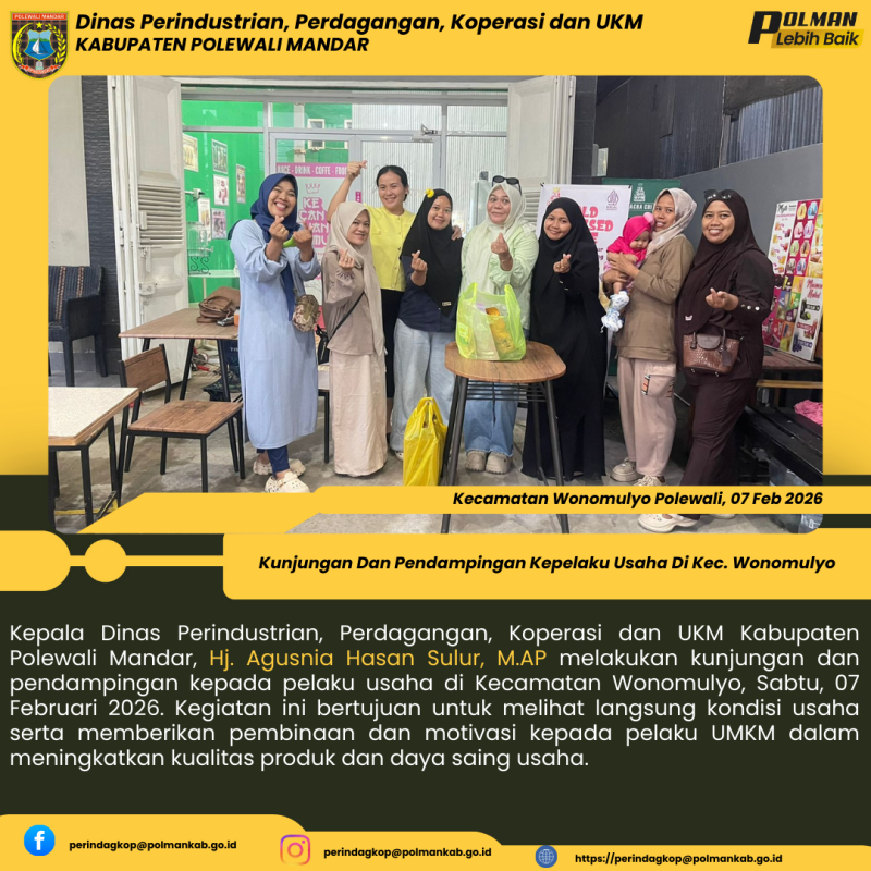 Kepala Dinas Perindustrian, Perdagangan, Koperasi dan UKM Kabupaten Polewali Mandar, Hj. Agusnia Hasan Sulur, M.AP melakukan kunjungan dan pendampingan kepada pelaku usaha di Kecamatan Wonomulyo, Sabtu, 07 Februari 2026. Kegiatan ini bertujuan untuk melihat langsung kondisi usaha serta memberikan pembinaan dan motivasi kepada pelaku UMKM dalam meningkatkan kualitas produk dan daya saing usaha.