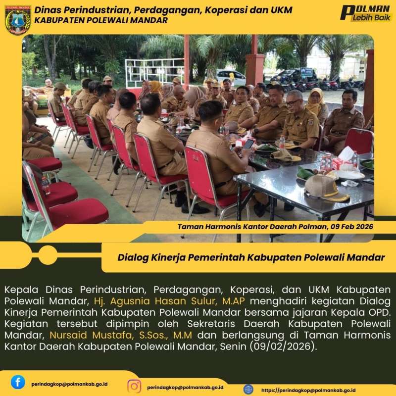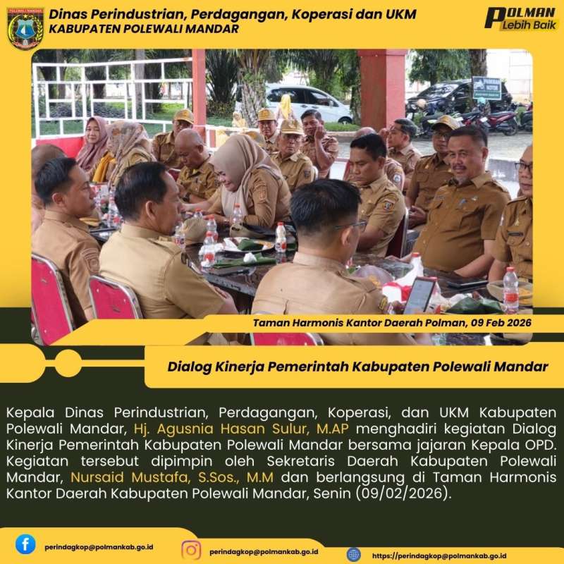 Kepala Dinas Perindustrian, Perdagangan, Koperasi, dan UKM Kabupaten Polewali Mandar, Hj. Agusnia Hasan Sulur, M.AP menghadiri kegiatan Dialog Kinerja Pemerintah Kabupaten Polewali Mandar bersama jajaran Kepala OPD. Kegiatan tersebut dipimpin oleh Sekretaris Daerah Kabupaten Polewali Mandar, Nursaid Mustafa, S.Sos., M.M dan berlangsung di Taman Harmonis Kantor Daerah Kabupaten Polewali Mandar, Senin (09/02/2026).
