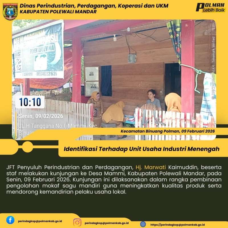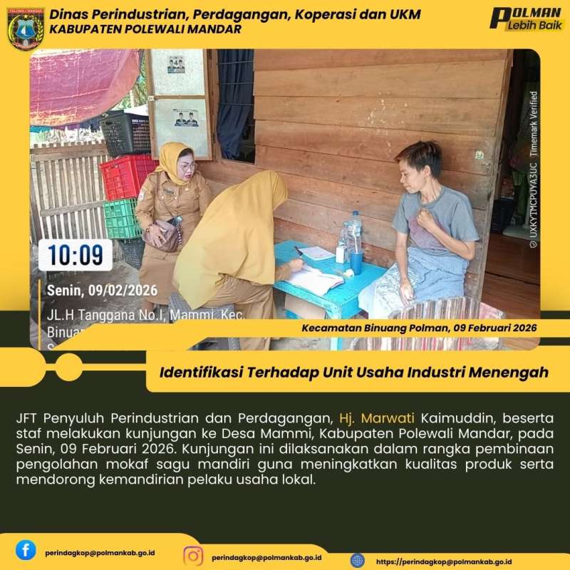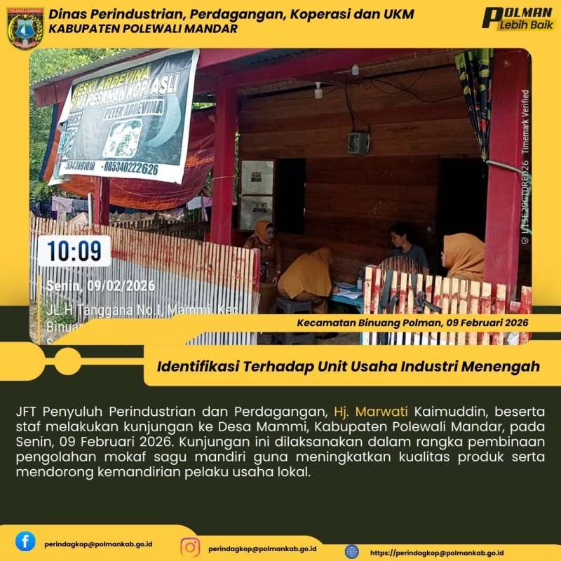 JFT Penyuluh Perindustrian dan Perdagangan, Hj. Marwati Kaimuddin, beserta staf melakukan kunjungan ke Desa Mammi, Kabupaten Polewali Mandar, pada Senin, 09 Februari 2026. Kunjungan ini dilaksanakan dalam rangka pembinaan pengolahan mokaf sagu mandiri guna meningkatkan kualitas produk serta mendorong kemandirian pelaku usaha lokal.