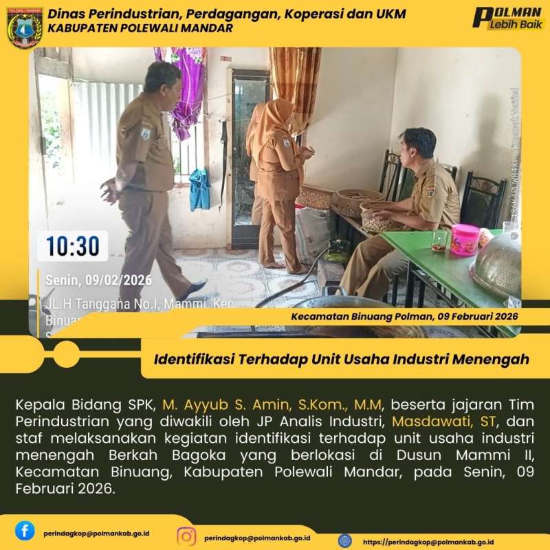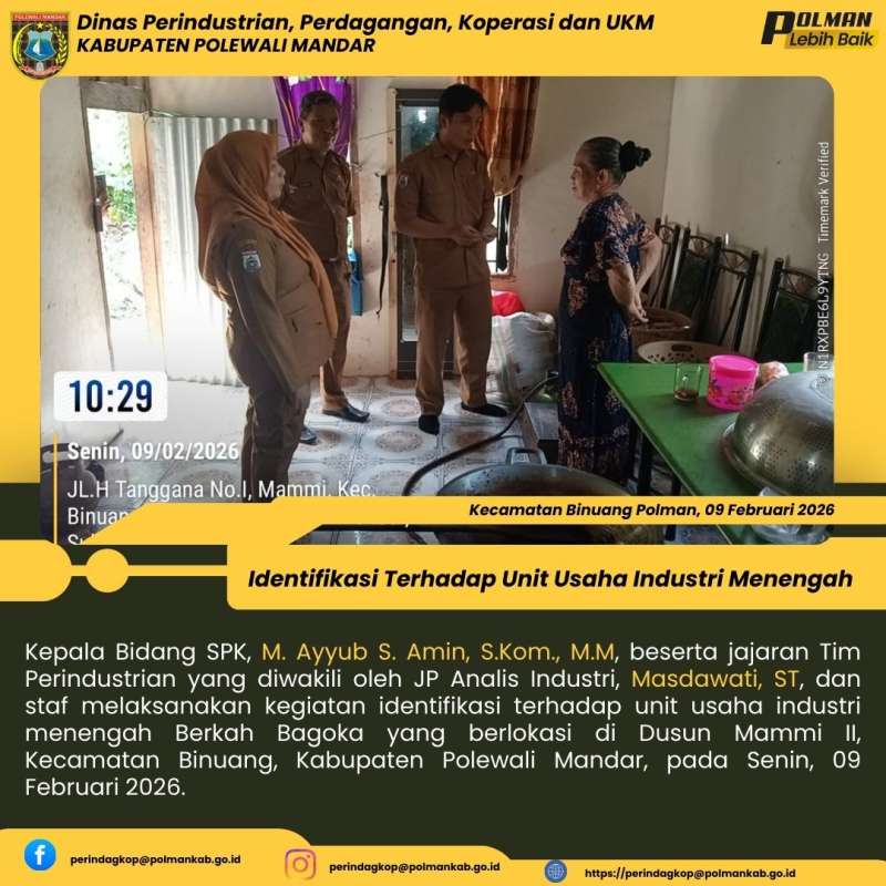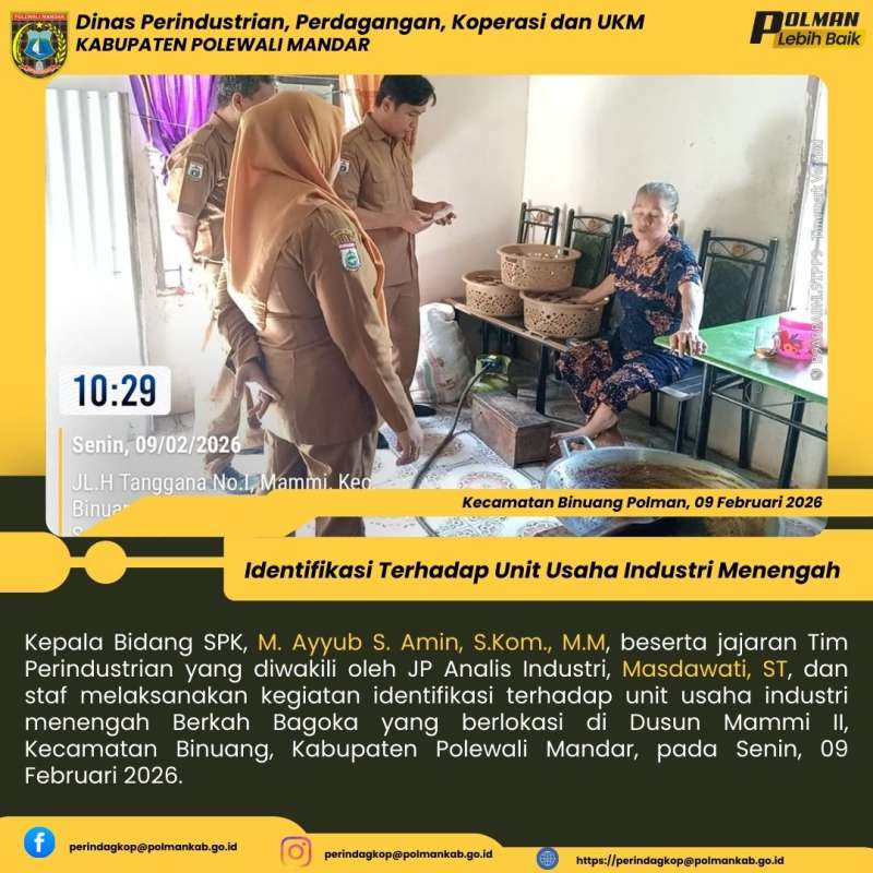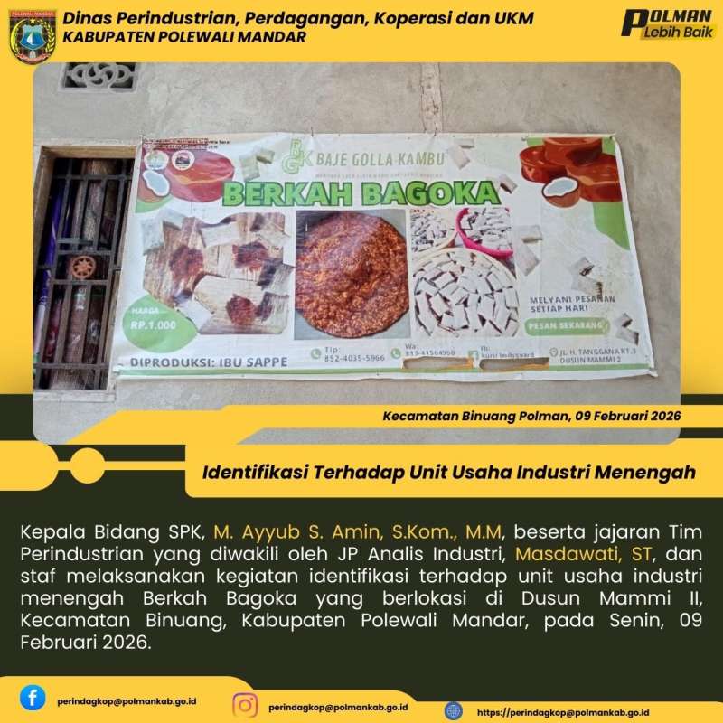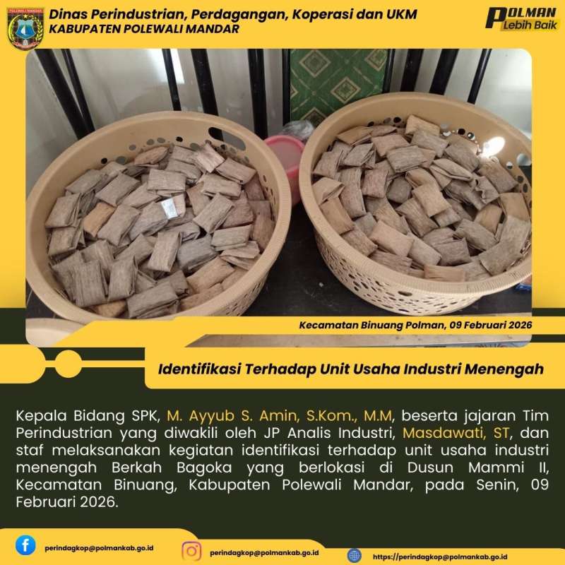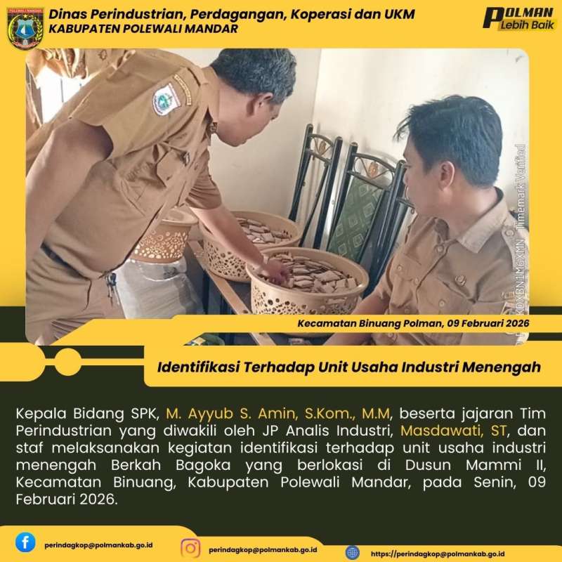 Kepala Bidang SPK, M. Ayyub S. Amin, S.Kom., M.M, beserta jajaran Tim Perindustrian yang diwakili oleh JP Analis Industri, Masdawati, ST, dan staf melaksanakan kegiatan identifikasi terhadap unit usaha industri menengah Berkah Bagoka yang berlokasi di Dusun Mammi II, Kecamatan Binuang, Kabupaten Polewali Mandar, pada Senin, 09 Februari 2026.
