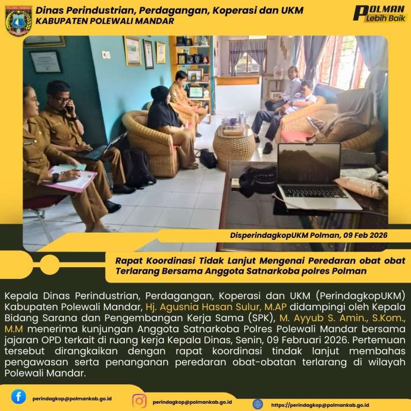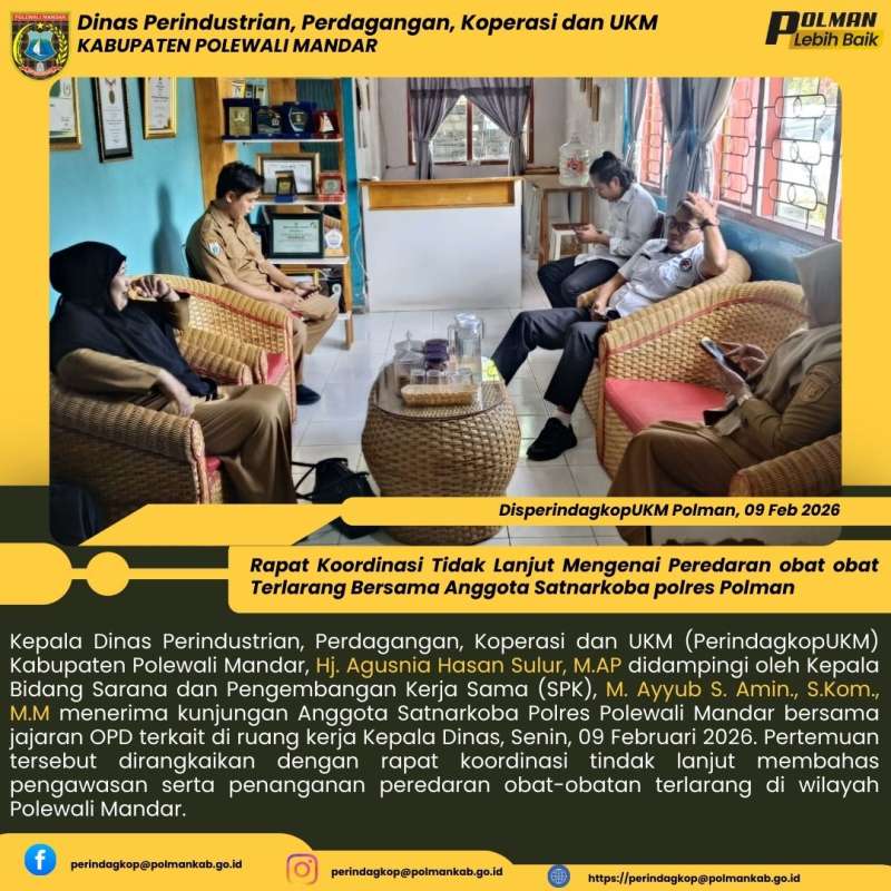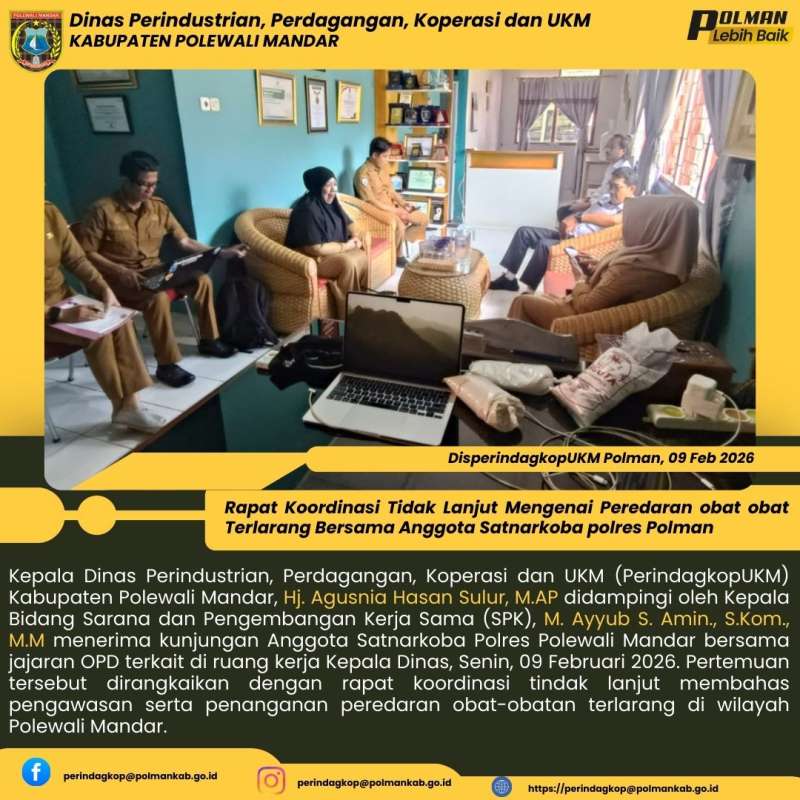 Kepala Dinas Perindustrian, Perdagangan, Koperasi dan UKM (PerindagkopUKM) Kabupaten Polewali Mandar, Hj. Agusnia Hasan Sulur, M.AP didampingi oleh Kepala Bidang Sarana dan Pengembangan Kerja Sama (SPK), M. Ayyub S. Amin., S.Kom., M.M menerima kunjungan Anggota Satnarkoba Polres Polewali Mandar bersama jajaran OPD terkait di ruang kerja Kepala Dinas, Senin, 09 Februari 2026. Pertemuan tersebut dirangkaikan dengan rapat koordinasi tindak lanjut membahas pengawasan serta penanganan peredaran obat-obatan terlarang di wilayah Polewali Mandar.