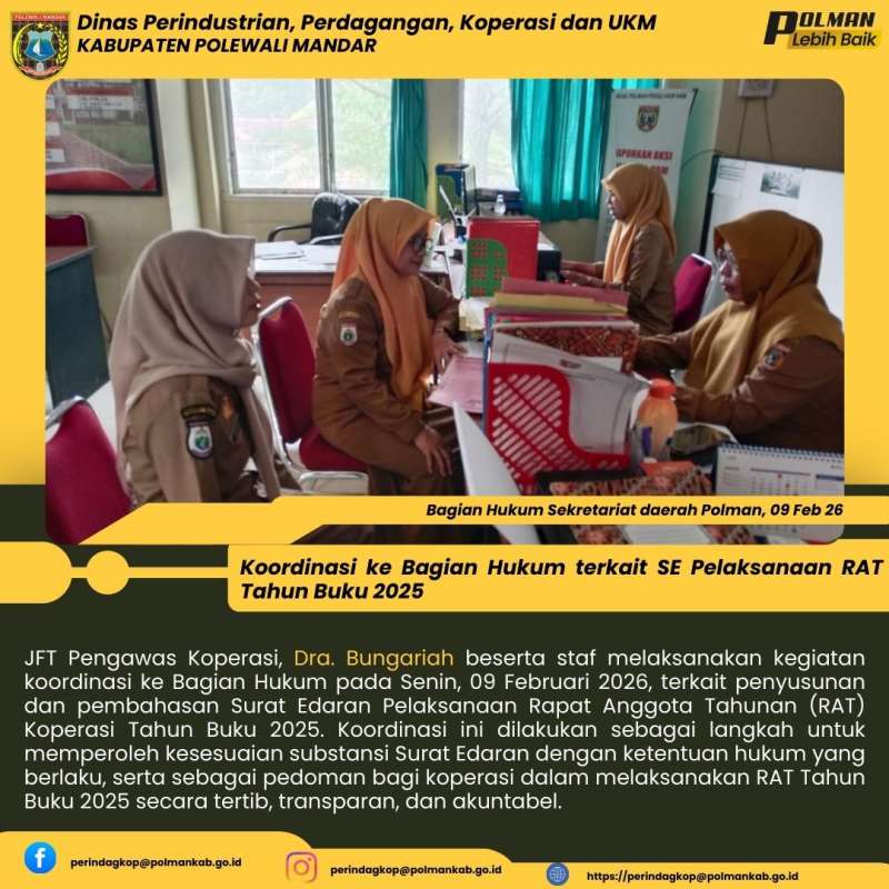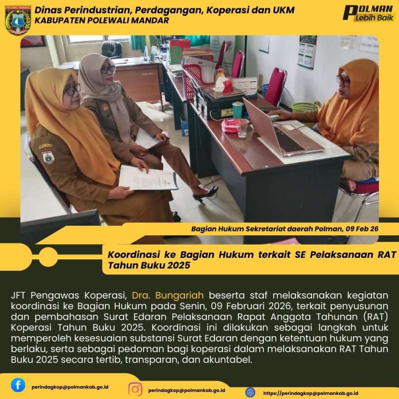 JFT Pengawas Koperasi, Dra. Bungariah beserta staf melaksanakan kegiatan koordinasi ke Bagian Hukum pada Senin, 09 Februari 2026, terkait penyusunan dan pembahasan Surat Edaran Pelaksanaan Rapat Anggota Tahunan (RAT) Koperasi Tahun Buku 2025. Koordinasi ini dilakukan sebagai langkah untuk memperoleh kesesuaian substansi Surat Edaran dengan ketentuan hukum yang berlaku, serta sebagai pedoman bagi koperasi dalam melaksanakan RAT Tahun Buku 2025 secara tertib, transparan, dan akuntabel.