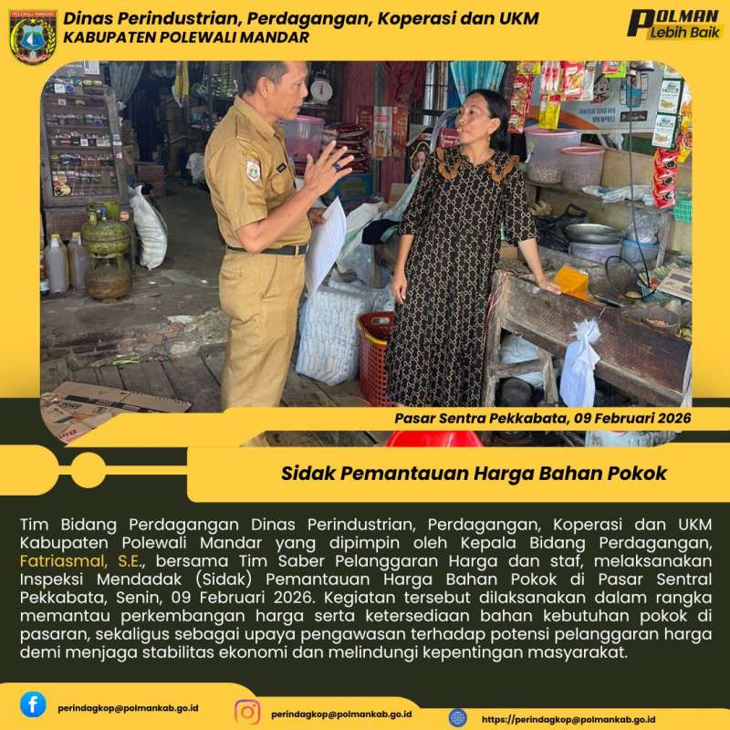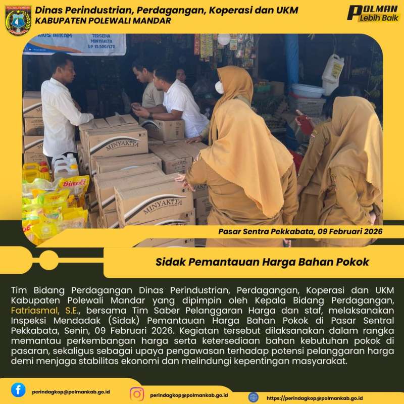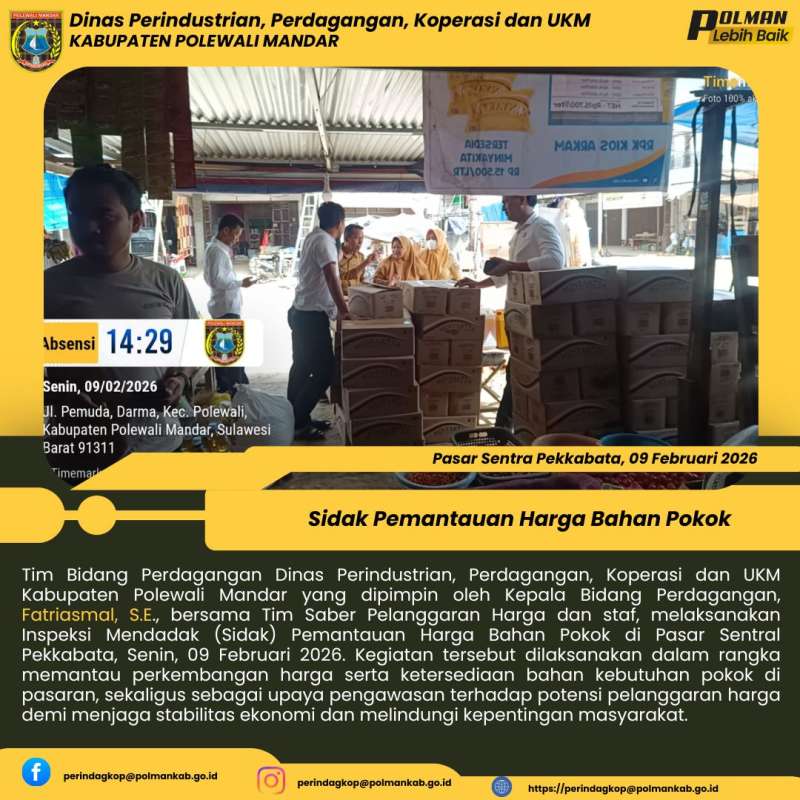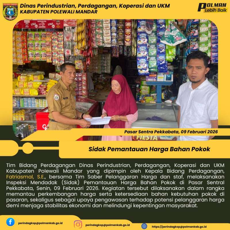 Tim Bidang Perdagangan Dinas Perindustrian, Perdagangan, Koperasi dan UKM Kabupaten Polewali Mandar yang dipimpin oleh Kepala Bidang Perdagangan, Fatriasmal, S.E., bersama Tim Saber Pelanggaran Harga dan staf, melaksanakan Inspeksi Mendadak (Sidak) Pemantauan Harga Bahan Pokok di Pasar Sentral Pekkabata, Senin, 09 Februari 2026. Kegiatan tersebut dilaksanakan dalam rangka memantau perkembangan harga serta ketersediaan bahan kebutuhan pokok di pasaran, sekaligus sebagai upaya pengawasan terhadap potensi pelanggaran harga demi menjaga stabilitas ekonomi dan melindungi kepentingan masyarakat.