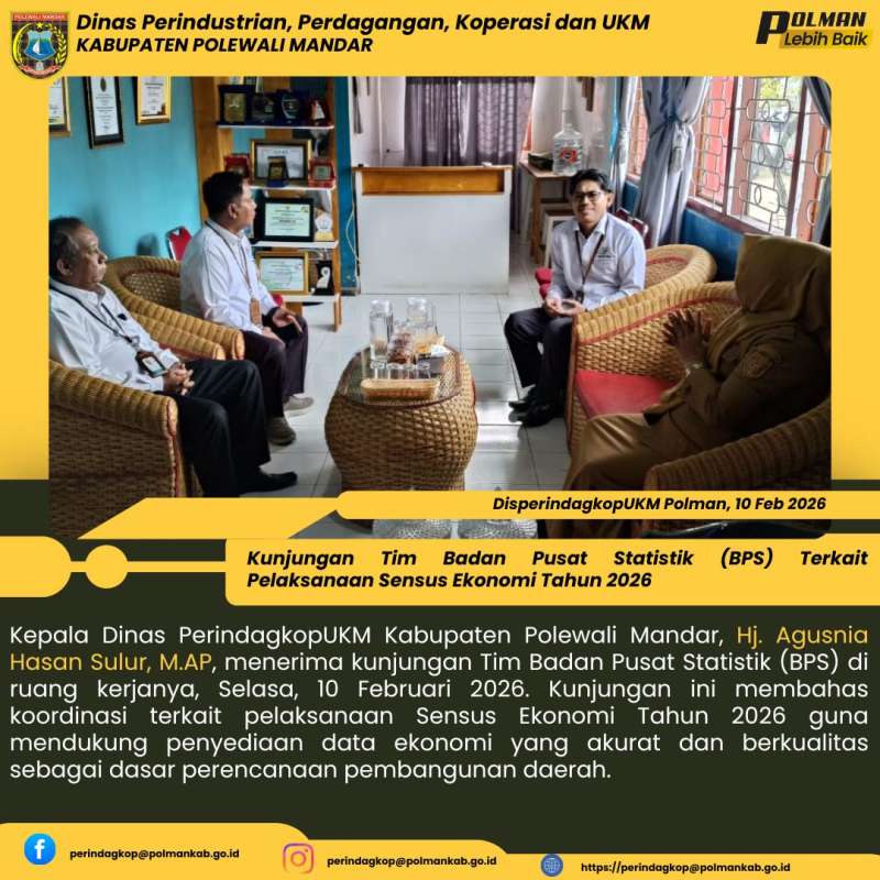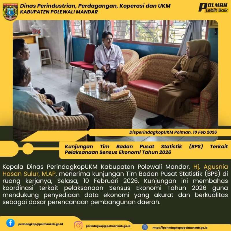Kepala Dinas PerindagkopUKM Kabupaten Polewali Mandar, Hj. Agusnia Hasan Sulur, M.AP, menerima kunjungan Tim Badan Pusat Statistik (BPS) di ruang kerjanya, Selasa, 10 Februari 2026. Kunjungan ini membahas koordinasi terkait pelaksanaan Sensus Ekonomi Tahun 2026 guna mendukung penyediaan data ekonomi yang akurat dan berkualitas sebagai dasar perencanaan pembangunan daerah.