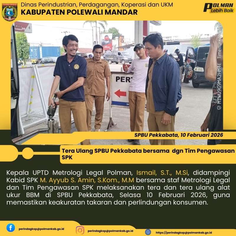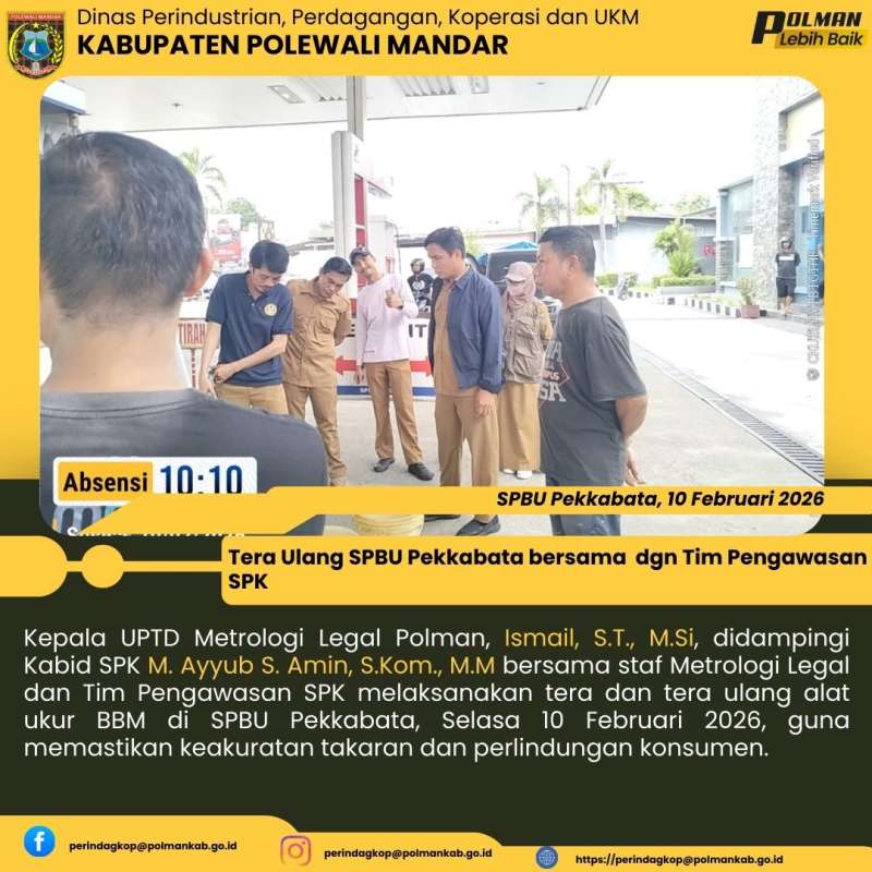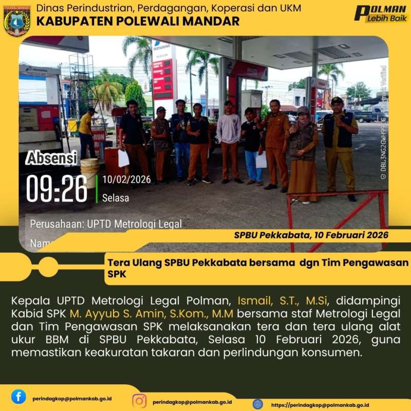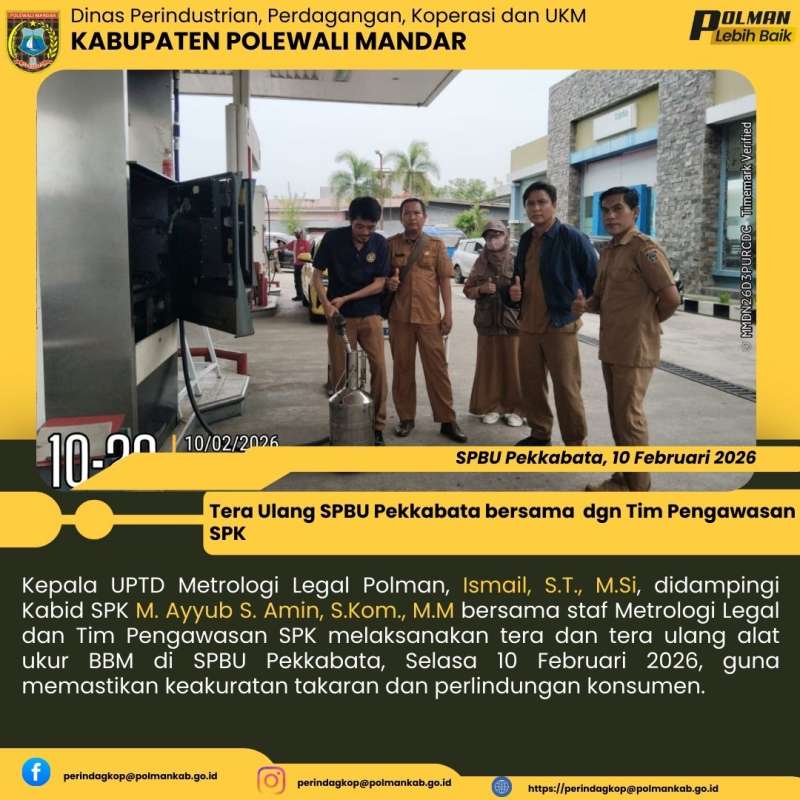 Kepala UPTD Metrologi Legal Polman, Ismail, S.T., M.Si, didampingi Kabid SPK M. Ayyub S. Amin, S.Kom., M.M bersama staf Metrologi Legal dan Tim Pengawasan SPK melaksanakan tera dan tera ulang alat ukur BBM di SPBU Pekkabata, Selasa 10 Februari 2026, guna memastikan keakuratan takaran dan perlindungan konsumen.