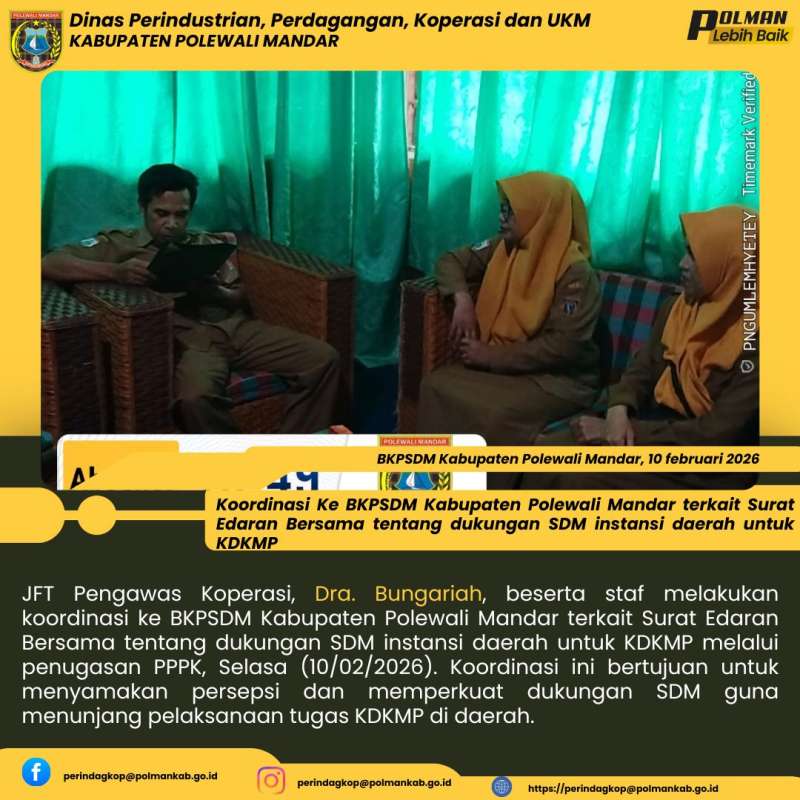 JFT Pengawas Koperasi, Dra. Bungariah, beserta staf melakukan koordinasi ke BKPSDM Kabupaten Polewali Mandar terkait Surat Edaran Bersama tentang dukungan SDM instansi daerah untuk KDKMP melalui penugasan PPPK, Selasa (10/02/2026). Koordinasi ini bertujuan untuk menyamakan persepsi dan memperkuat dukungan SDM guna menunjang pelaksanaan tugas KDKMP di daerah.