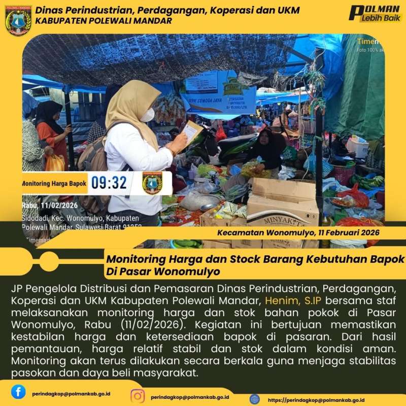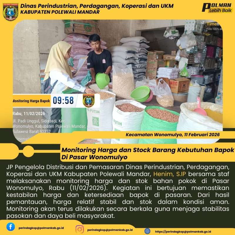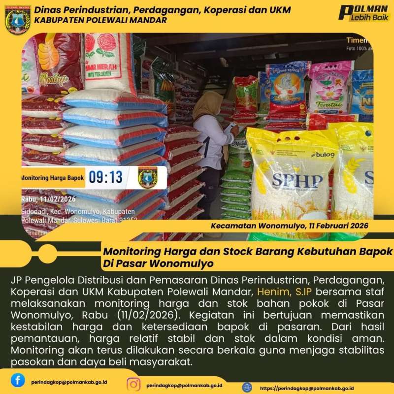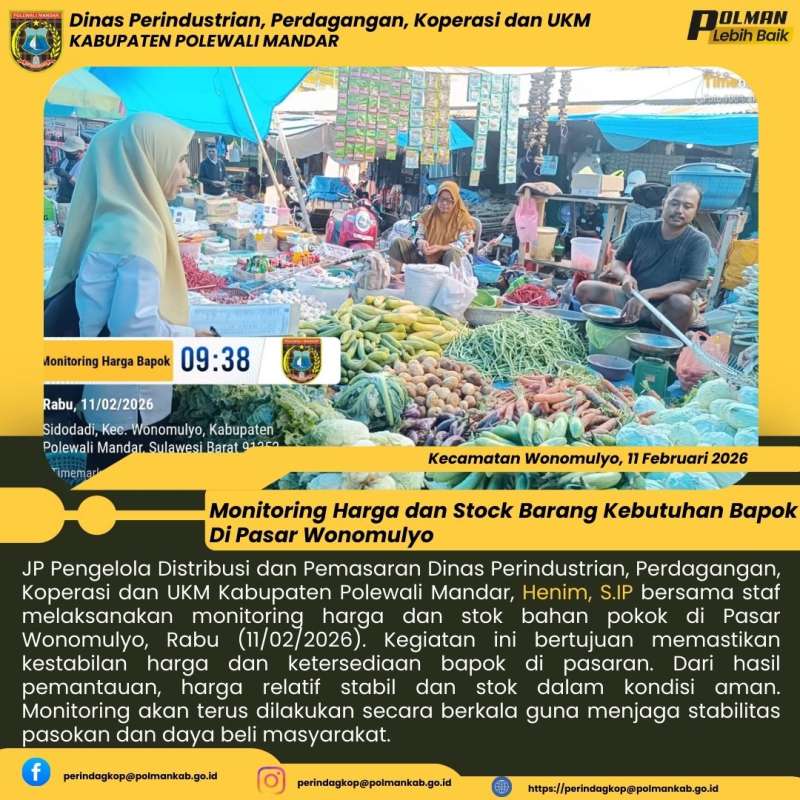 JP Pengelola Distribusi dan Pemasaran Dinas Perindustrian, Perdagangan, Koperasi dan UKM Kabupaten Polewali Mandar, Henim, S.IP bersama staf melaksanakan monitoring harga dan stok bahan pokok di Pasar Wonomulyo, Rabu (11/02/2026). Kegiatan ini bertujuan memastikan kestabilan harga dan ketersediaan bapok di pasaran. Dari hasil pemantauan, harga relatif stabil dan stok dalam kondisi aman. Monitoring akan terus dilakukan secara berkala guna menjaga stabilitas pasokan dan daya beli masyarakat.