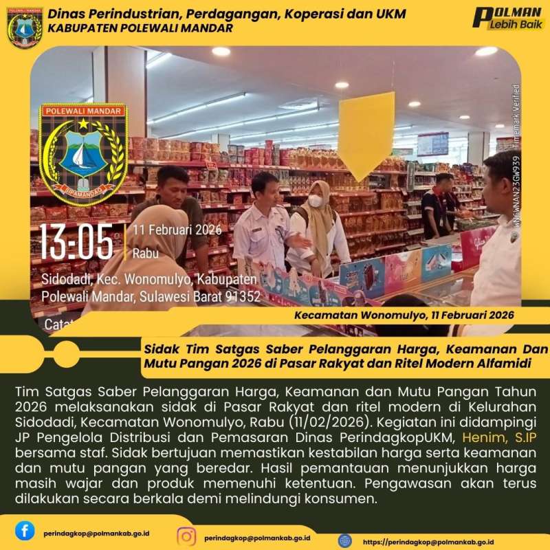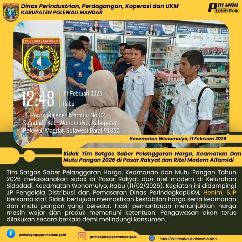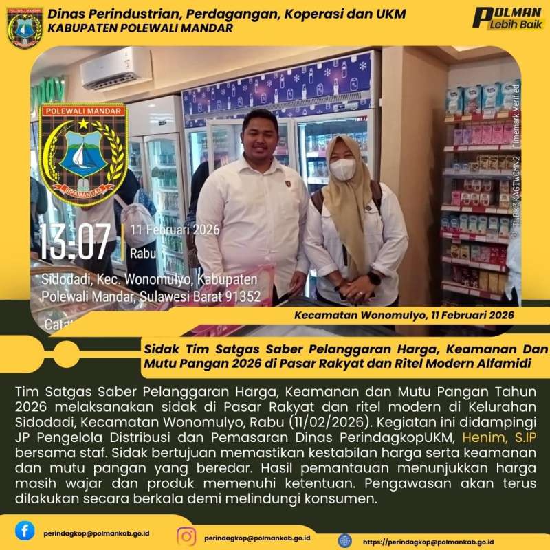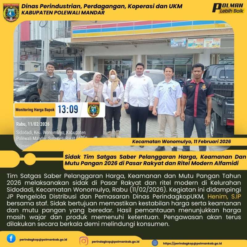 Tim Satgas Saber Pelanggaran Harga, Keamanan dan Mutu Pangan Tahun 2026 melaksanakan sidak di Pasar Rakyat dan ritel modern di Kelurahan Sidodadi, Kecamatan Wonomulyo, Rabu (11/02/2026). Kegiatan ini didampingi JP Pengelola Distribusi dan Pemasaran Dinas PerindagkopUKM, Henim, S.IP bersama staf. Sidak bertujuan memastikan kestabilan harga serta keamanan dan mutu pangan yang beredar. Hasil pemantauan menunjukkan harga masih wajar dan produk memenuhi ketentuan. Pengawasan akan terus dilakukan secara berkala demi melindungi konsumen.