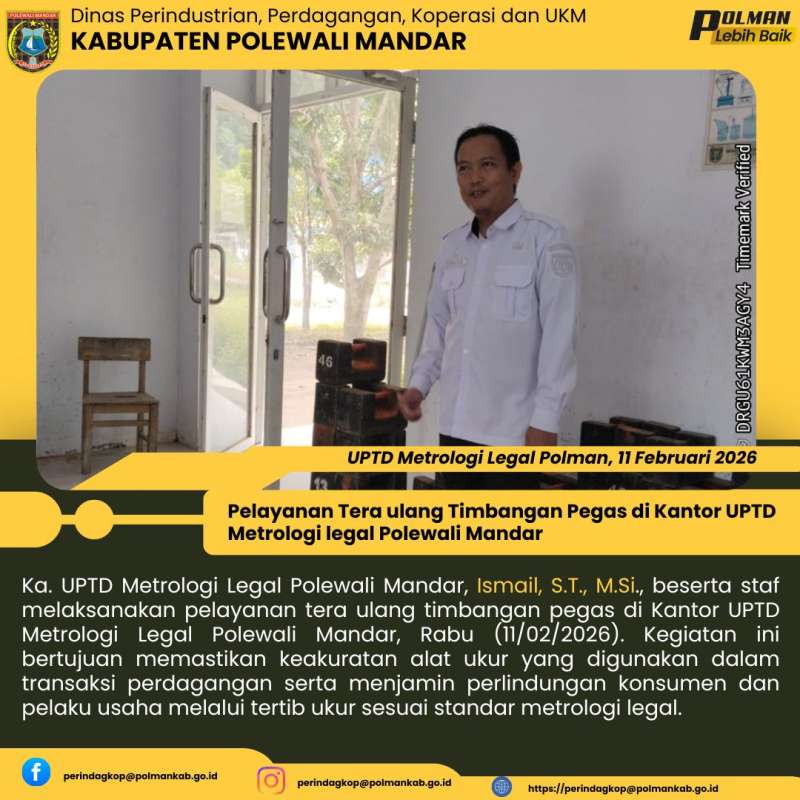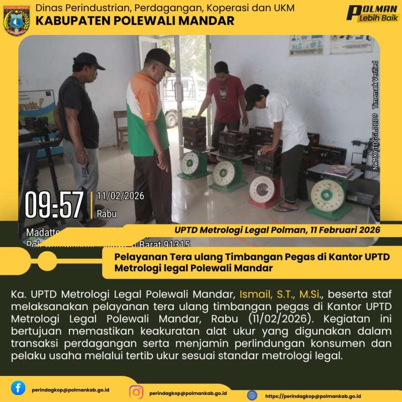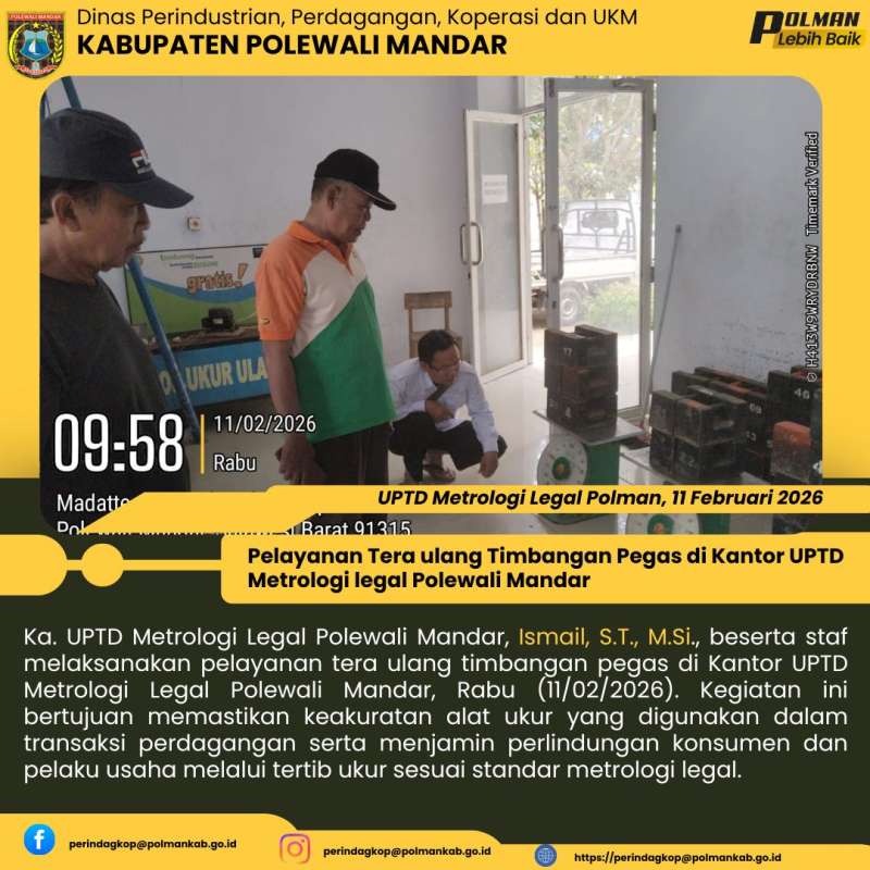 Ka. UPTD Metrologi Legal Polewali Mandar, Ismail, S.T., M.Si., beserta staf melaksanakan pelayanan tera ulang timbangan pegas di Kantor UPTD Metrologi Legal Polewali Mandar, Rabu (11/02/2026). Kegiatan ini bertujuan memastikan keakuratan alat ukur yang digunakan dalam transaksi perdagangan serta menjamin perlindungan konsumen dan pelaku usaha melalui tertib ukur sesuai standar metrologi legal.