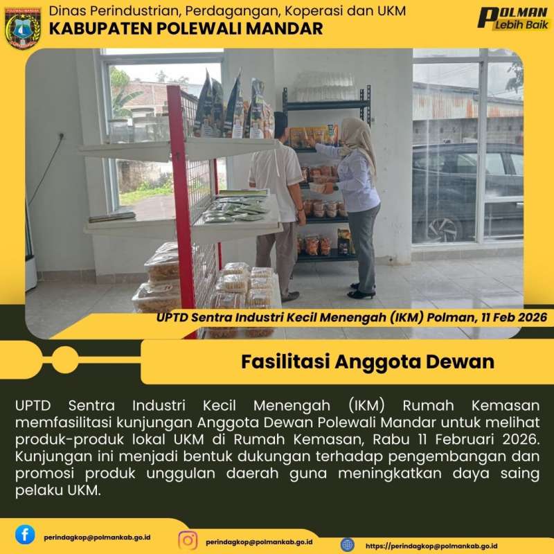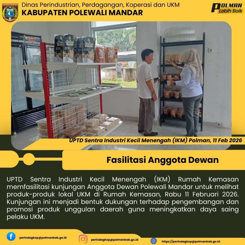 UPTD Sentra Industri Kecil Menengah (IKM) Rumah Kemasan memfasilitasi kunjungan Anggota Dewan Polewali Mandar untuk melihat produk-produk lokal UKM di Rumah Kemasan, Rabu 11 Februari 2026. Kunjungan ini menjadi bentuk dukungan terhadap pengembangan dan promosi produk unggulan daerah guna meningkatkan daya saing pelaku UKM.